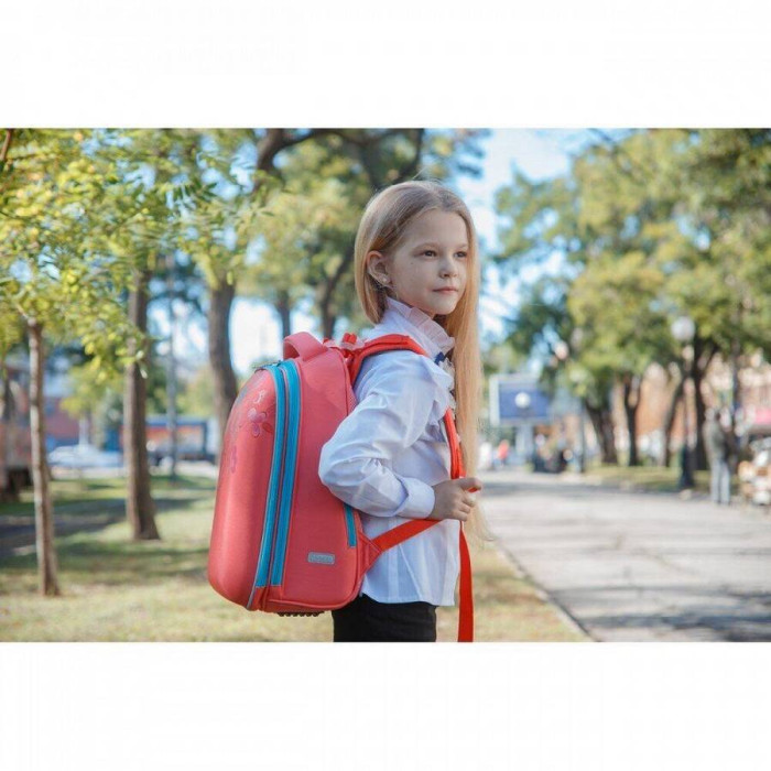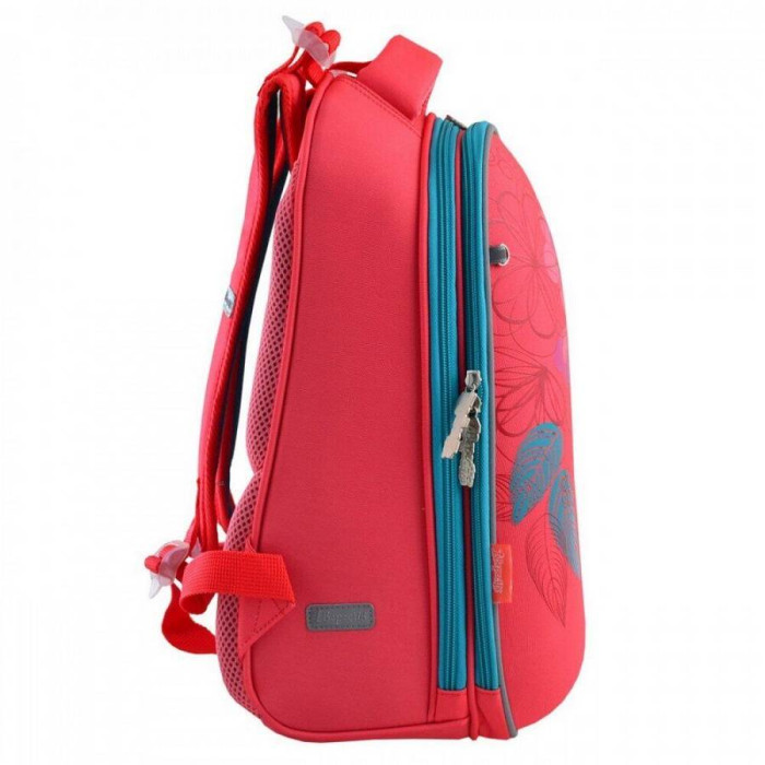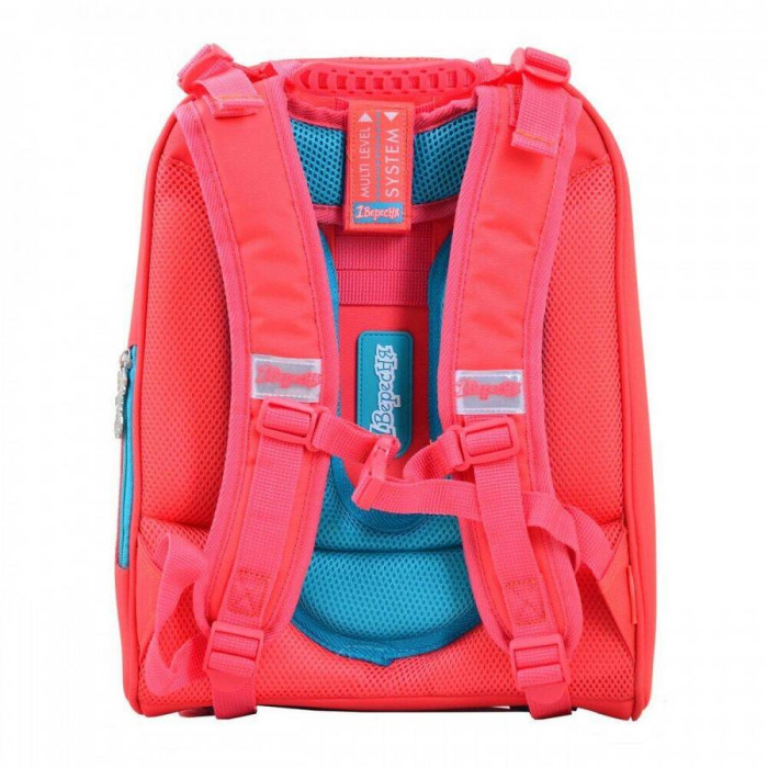 Особливості: виготовлений з поліестеру з водовідштовхувальним просоченням, що забезпечує збереження речей вашої дитини в будь-яку негоду, а щільний каркас гарантує повну цілісність вмісту (на лицьовій частині також є вставка з матеріалу EVA). Ортопедична спинка зменшує напругу м'язів спини, плечей і шиї, і забезпечує правильну поставу. Вона обшита "дихаючим" матеріалом Air Mesh. Також у рюкзака комфортні м'які лямки регульованої довжини (+нагрудний ремінь), щільне каркасне дно з двома металевими ніжками, зручна прогумована ручка для носіння в руці. В цілях безпеки передбачені світловідбиваючі елементи з різних боків рюкзака.