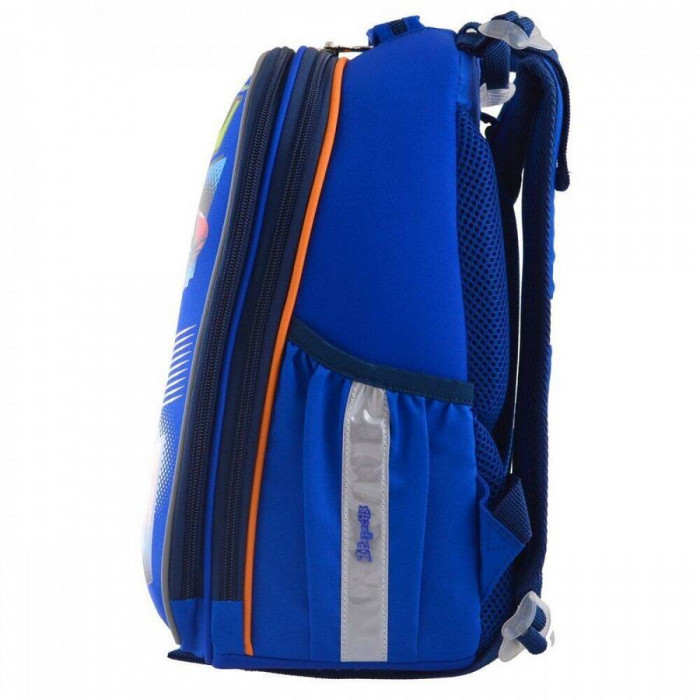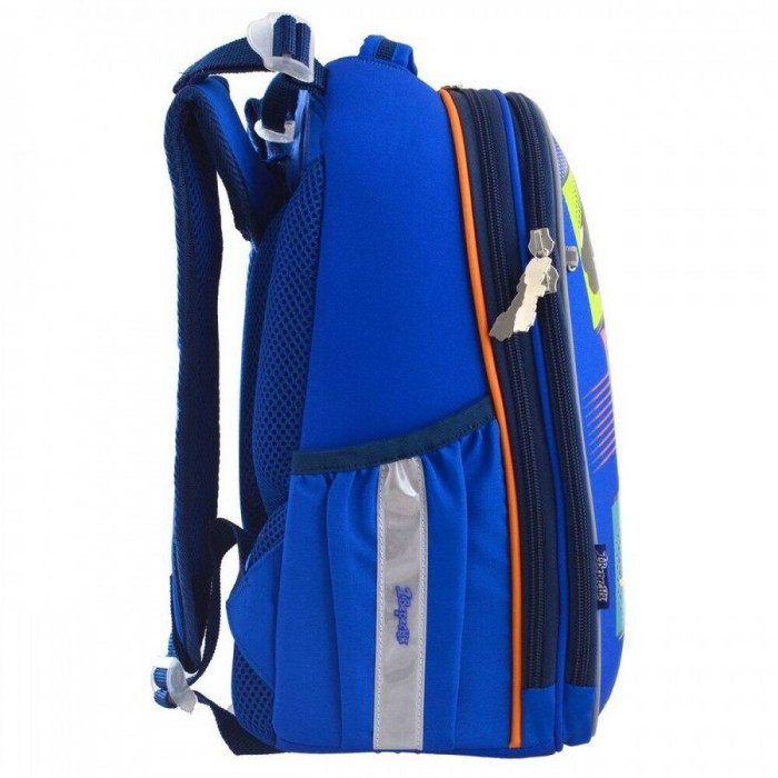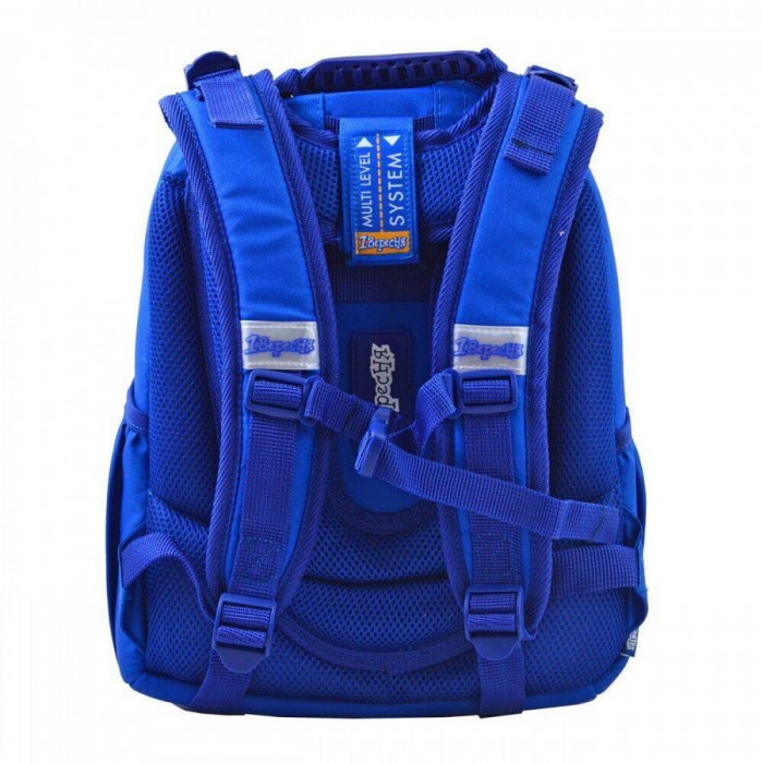 Особливості: виготовлений з поліестеру з водовідштовхувальним просоченням, що забезпечує збереження речей вашої дитини в будь-яку негоду, а щільний каркас гарантує повну цілісність вмісту (на лицьовій частині також є вставка з матеріалу EVA). Ортопедична спинка зменшує напругу м'язів спини, плечей і шиї, і забезпечує правильну поставу. Вона обшита "дихаючим" матеріалом Air Mesh. Також у рюкзака комфортні м'які лямки регульованої довжини (+нагрудний ремінь), щільне каркасне дно з захисними накладками, зручна ущільнена ручка для носіння в руці. В цілях безпеки передбачені світловідбиваючі елементи з різних боків рюкзака.