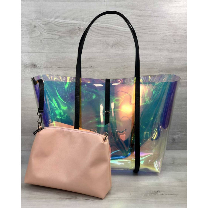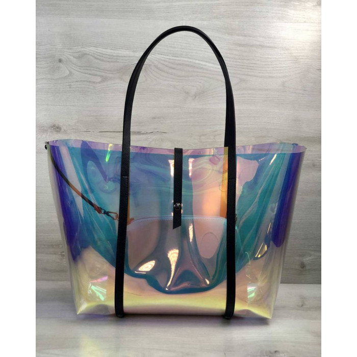 Стильна пляжна сумка виконана з перламутрового силікону (напівпрозора). Закривається за допомогою хлястика на кнопці. В залежності від світла переливається всіма кольорами веселки. Ідеально поєднується з пляжного кепкою (код:56502).