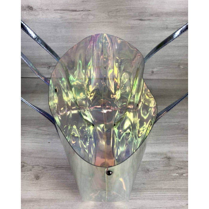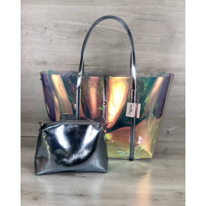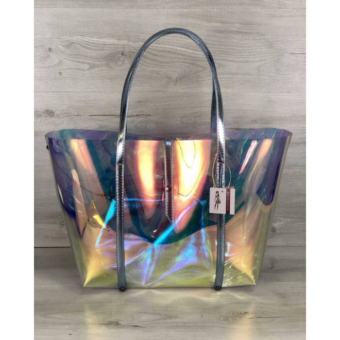 Стильна пляжна сумка виконана з перламутрового силікону (напівпрозора). Закривається за допомогою хлястика на кнопці. В залежності від світла переливається всіма кольорами веселки. Ідеально поєднується з пляжною кепкою (код:56502).