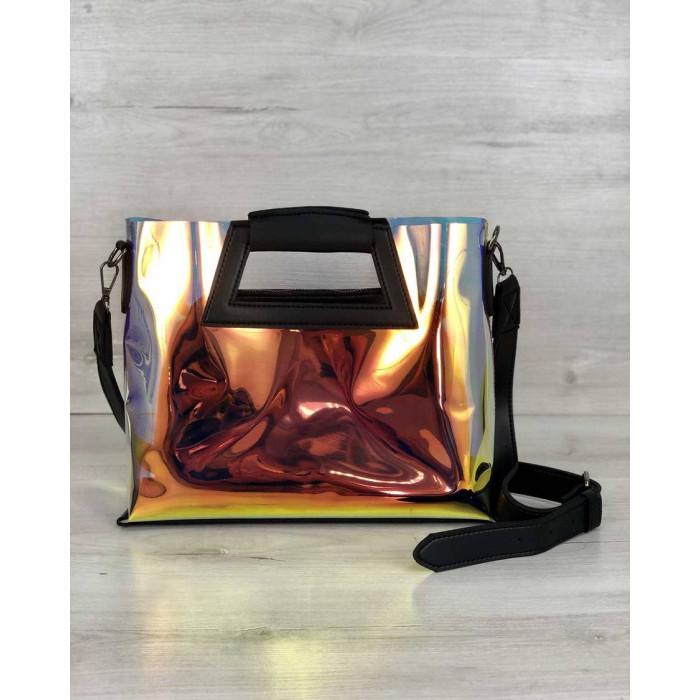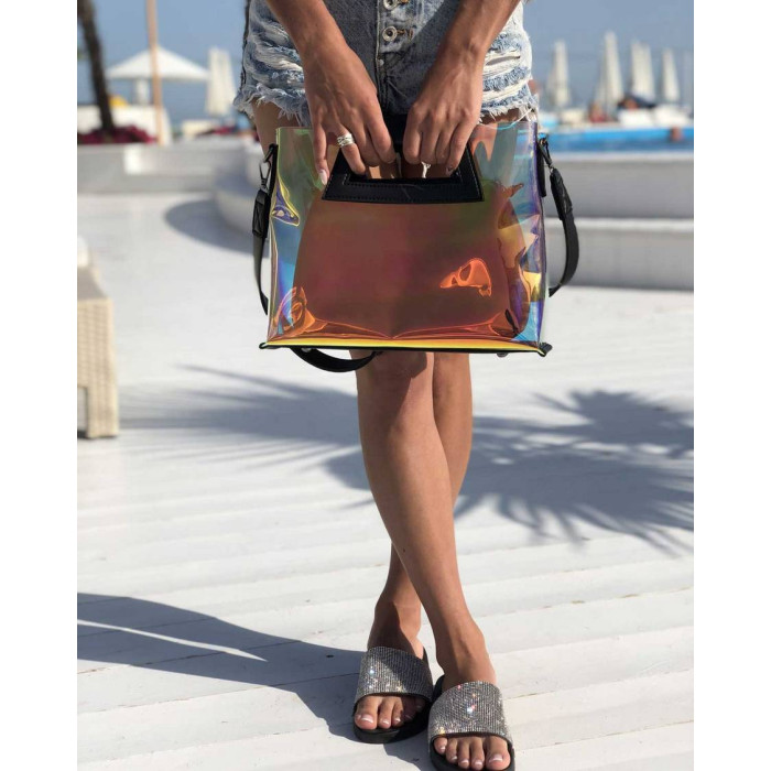 Стильна жіноча сумка виконана з перламутрового силікону (напівпрозора). Закривається за допомогою магніту між ручками. В залежності від світла переливається всіма кольорами веселки. В комплекті сумки є плечовий ремінь, шириною 3 см і максимальною довжиною 115 см. Плечовий ремінь можна застібнути на косметичку, і носити косметичку як окрему сумочку. Розміри косметички: довжина 27 см, ширина 9 см, висота 18 см.