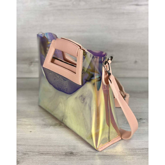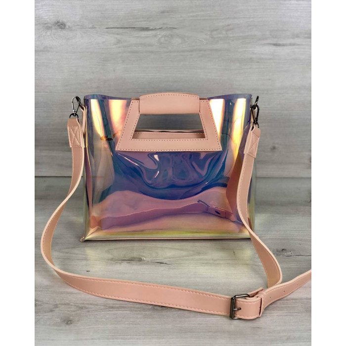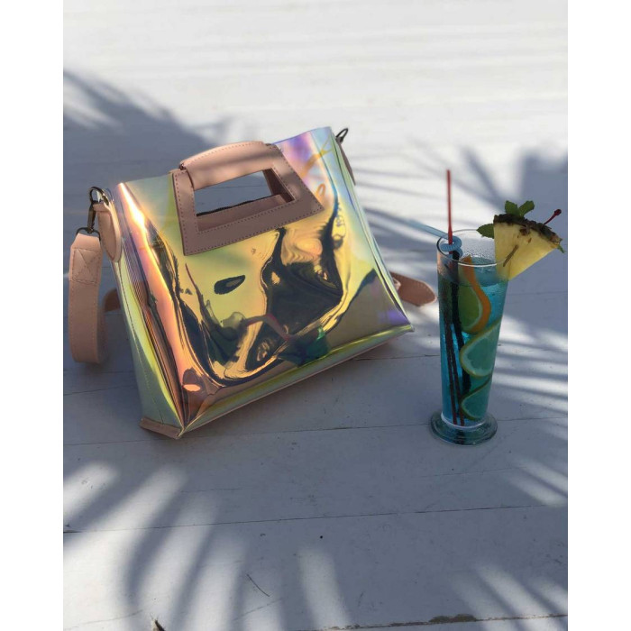 Стильна жіноча сумка виконана з перламутрового силікону (напівпрозора). Закривається за допомогою магніту між ручками. В залежності від світла переливається всіма кольорами веселки. В комплекті сумки є плечовий ремінь, шириною 3 см і максимальною довжиною 115 см. Плечовий ремінь можна застібнути на косметичку, і носити косметичку як окрему сумочку. Розміри косметички: довжина 27 см, ширина 9 см, висота 18 см.