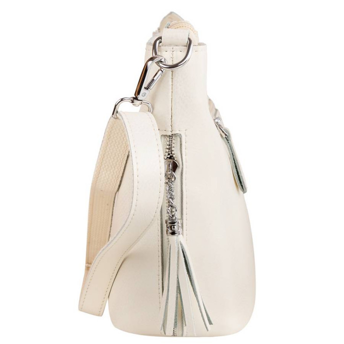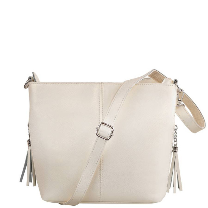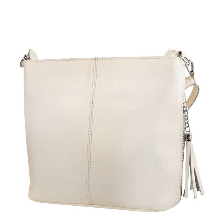 Повітряно-ніжним, неймовірно жіночним робить образ, створений дизайнерами торгової марки ETERNO, відтінок білого кольору. Натуральна шкіра визначає представництво і елегантність цього аксесуара. Бездоганно виконані оздоблювальні шви і строчки, акуратна обробка, співзвуччя світло-однотонності з яскравістю сріблястого блиску металевих деталей фурнітури складається в єдиний ансамбль. Сумочка, яку зручно носити, помітно освіжить кожен Ваш наряд і постане в найбільш вигідному світлі. Елегантні штрихи в квадратні пропорції вироби вносять вертикальні лінії блискавок прорізних кишень, які розташовані в бокових швах. Застібки мають подовжені брелоки у вигляді пензликів на ланцюжках, і в даному випадку це виглядає стильно. Щільне стійке дно, хороша місткість і компактні розміри, плюс брендове якість - запорука привабливості такої сумки. Купити її за оптимальною ціною Ви можете в нашому інтернет-магазині.