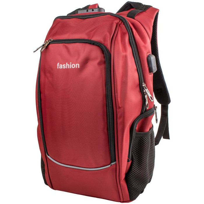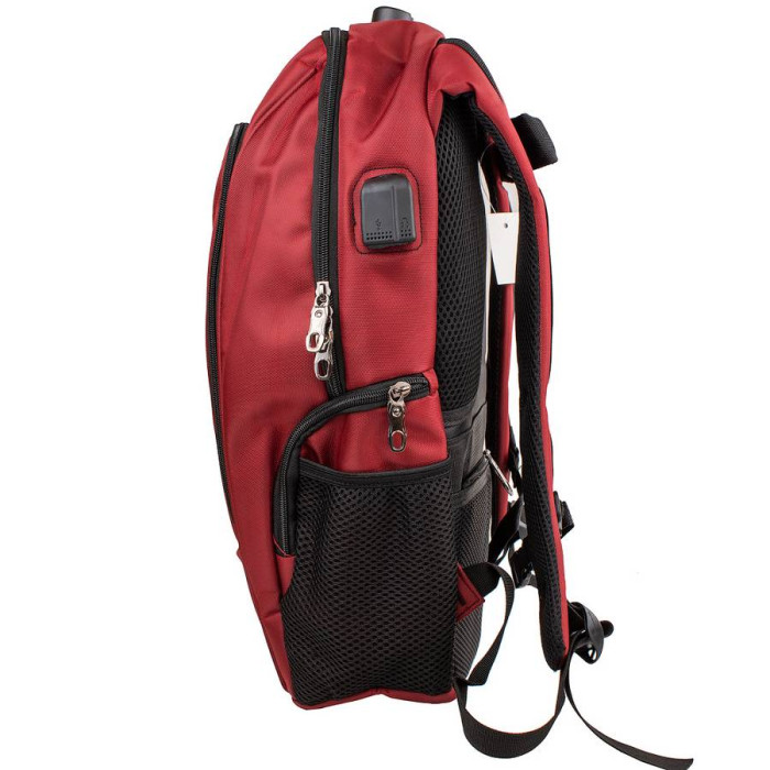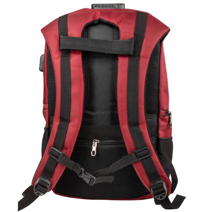 Зовнішні розміри рюкзака: 30*46*19 см. Об'єм: 27 л. Вага: 790 р. Матеріал: поліестер (тканина). Колір: червоний, чорний. Колір фурнітури: чорне срібло. Тип конструкції: м'який рюкзак. Кількість основних відділень: 1. Всередині є накладна кишеня для ноутбука (фіксується ремінцем на липучці) і 2 накладних кишені з сіткою. Додаткові відділення: 1. Рюкзак має 4 бічні кишені: 2 з них з сіткою 3D airmesh, а 2 застібаються на блискавку. На тильній стороні рюкзака знаходиться додатковий кишеню на блискавці. На спинці рюкзака є ремінь для кріплення до ручки дорожньої валізи. Спинка рюкзака анатомічна, вона виконана з використанням підклади з поропласту і сітки 3D airmesh, яка не перешкоджає вільній циркуляції повітря. Плечові лямки мають анатомічну форму. Вони забезпечені щільною підкладкою з поропласту, а їх тильна сторона виконана з сітки 3D airmesh. Довжина лямок може регулюватися за допомогою пластикових пряжок. Плечові лямки можна скріпити між собою на грудях за допомогою ременя на пластиковій пряжці. Довжина ременя регулюється. На рюкзаку є невеликі світловідбиваючі вставки. Виріб має зручну щільну ручку, за допомогою якої аксесуар можна переносити в руці або повісити на гачок. Рюкзак закривається за допомогою блискавки і має кодовий замок. Модель можна використовувати в якості міського рюкзака, для активного відпочинку, для нетривалих поїздок та походів вихідного дня. Виріб упаковано в поліетиленовий пакет. Документи формату А4 поміщаються в рюкзак. Країна походження торгової марки ETERNO - Україна, а країна-виробник - Китай. Гарантія: 1 місяць.