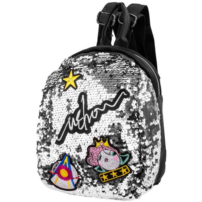 Зовнішні розміри рюкзака: 19 х 25 х 12. Матеріал: тканину. Матеріал підкладки: тканину. Колір: срібний. Колір фурнітури: чорне срібло. Гарантія: 1 місяць. Кількість основних відділень: 1. Всередині є 1 кишеня на блискавці. На тильній стороні виробу є кишеня на блискавці. Рюкзак має зручну ручку для того, щоб переносити виріб в руці або повісити на гачок. Довжину плечових лямок можна регулювати за допомогою металевих пряжок. Рюкзак закривається за допомогою блискавки . Виріб упаковано в поліетиленовий пакет. Документи формату А4 не поміщаються в рюкзак. Країна походження торгової марки VALIRIA FASHION і країна-виробник - Китай.
