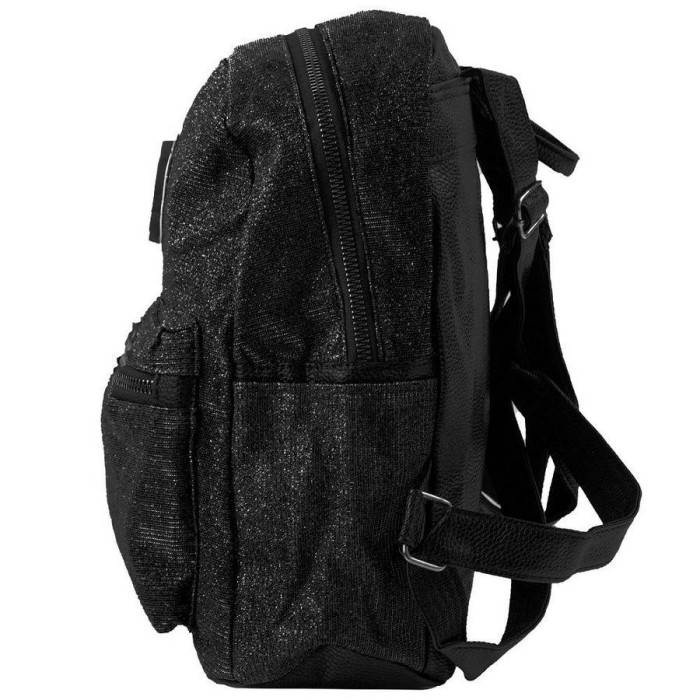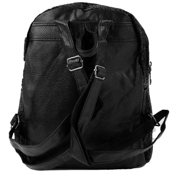 Зовнішні розміри рюкзака: 23 (по спинці) х 29 х 13. Кількість основних відділень: 1. Всередині є 1 велика накладна кишеня. Матеріал: тканина, шкірзамінник. Матеріал підкладки: тканина. Колір: чорний з блискітками. Колір фурнітури: срібло. Гарантія: 1 місяць. На лицьовій стороні розташована 1 накладна кишеня на блискавки. У рюкзака є 2 бічних кишені. Рюкзак має ручку-петлю для того, щоб переносити виріб в руці або повісити на гачок. Рюкзак закривається за допомогою блискавки. Виріб упаковано в поліетиленовий пакет. Документи формату А4 не поміщаються в рюкзак. Країна походження торгової марки VALIRIA FASHION і країна-виробник - Китай.