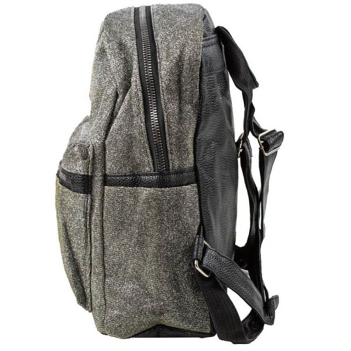 Зовнішні розміри рюкзака: 23 (по спинці) х 29 х 13. Кількість основних відділень: 1. Всередині є 1 велика накладна кишеня. Матеріал: тканина, шкірзамінник. Матеріал підкладки: тканина. Колір: срібний з блискітками. Колір фурнітури: срібло. Гарантія: 1 місяць. На лицьовій стороні розташована 1 накладна кишеня на блискавки. У рюкзака є 2 бічних кишені. Рюкзак має ручку-петлю для того, щоб переносити виріб в руці або повісити на гачок. Рюкзак закривається за допомогою блискавки. Виріб упаковано в поліетиленовий пакет. Документи формату А4 не поміщаються в рюкзак. Країна походження торгової марки VALIRIA FASHION і країна-виробник - Китай.