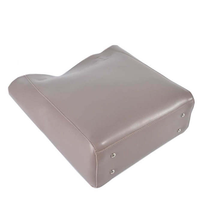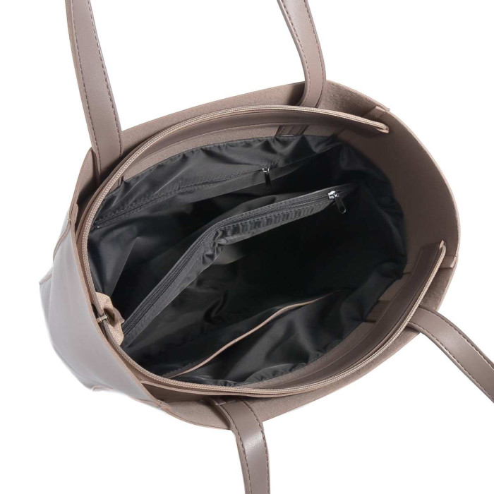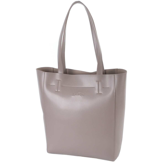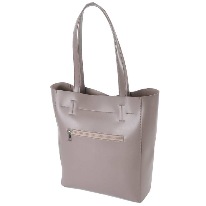 Сумку-шопер, з простим кроєм та мінімальним оздобленням, виконано з шкірозамінника високої якості, щоб її використання було максимально тривалим та приємним. Основна увага акцентується на гарній текстурі шкірзамінника ззовні, який з внутрішньої сторони має оригінальне покриття імітоване під велюр. Сумочка має дві довгі ручки, які розраховані на комфортне транспортування як в руці так і на плечі. Задня стінка оснащена врізною кишенею на застібці. На дні встановлені металеві ніжки. Весь виріб зачиняється на блискавку.