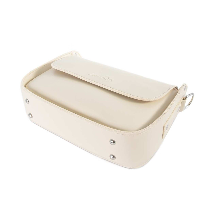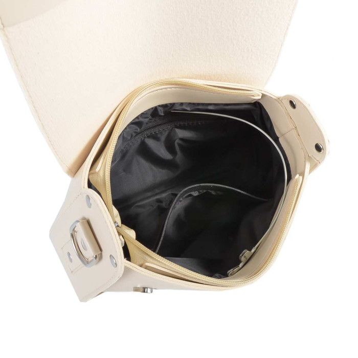 Весь виріб зачиняється на блискавку, яка накривається клапаном на магнітній кнопці. Сумочка має довгий ремінець, який можна відрегулювати під потрібний розмір, для легкого транспортування через плече, та короткий.