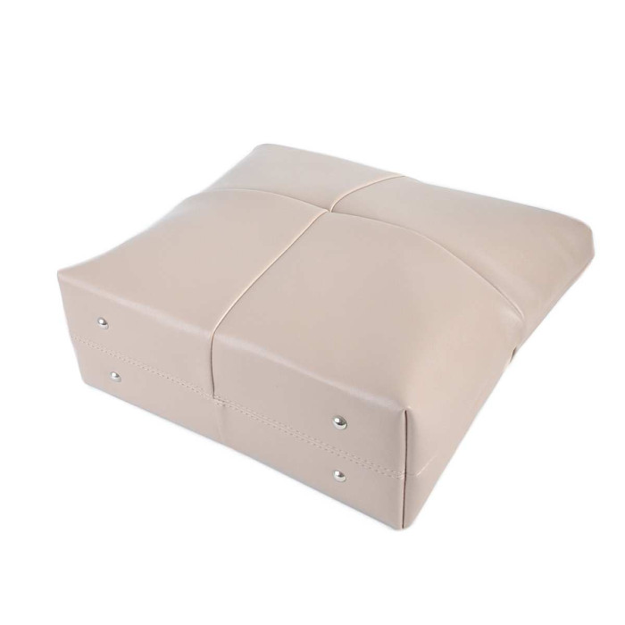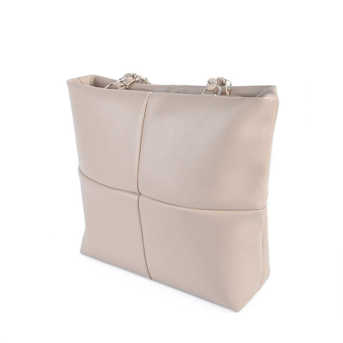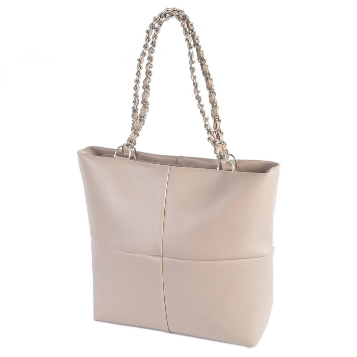 Сумку, з простим кроєм та мінімальним оздобленням, виконано з еошкіри високої якості, щоб її використання було максимально тривалим та приємним. Сумочка має дві ручки, які розраховані на комфортне транспортування в руці та на лікті. На дні сумки встановлені металеві ніжки. Весь виріб зачиняється на блискавку.