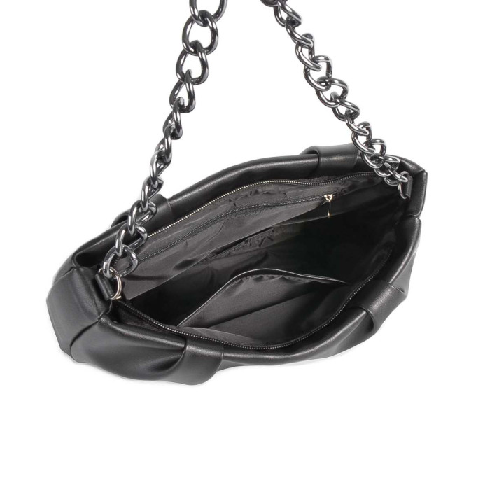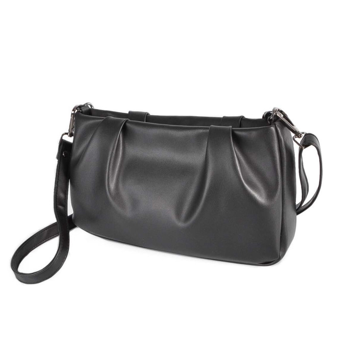 Сумка на одне загальне відділення. Не дивлячись на невеликі розміри, сумочка виявилась достатньо вмісткою. Весь виріб зачиняється на блискавку. Довгий ремінь з можливість регулювання довжини виготовлений з шкірзаміннику. На задній стінці вмонтована кишеня, яка зачиняється на блискавку. На дні встановлені металеві ніжки, які будуть захищати від пошкоджень.