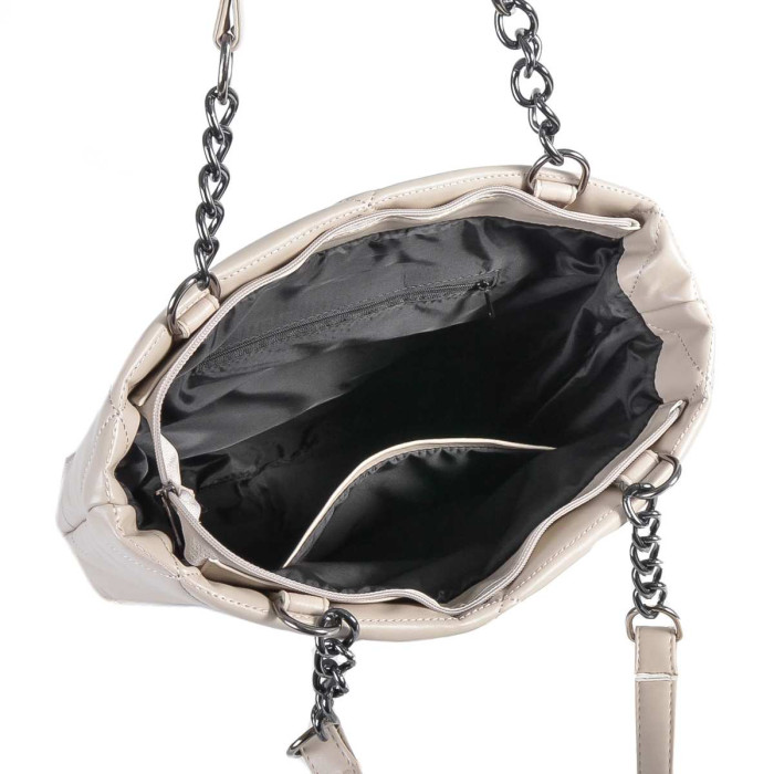 Всередині знаходяться одне основне відділення, та невеликий карман-перегородка на застібці. Для більшої зручності та створення порядку в сумці спеціально була розроблена одна відкрита кишеня для мобільного телефону та дрібниць, а з протилежного боку потаємна кишеня на застібці. Підкладка для внутрішньої частини виготовлена з якісного міцного текстильного матеріалу. Використовується міцна фурнітура.