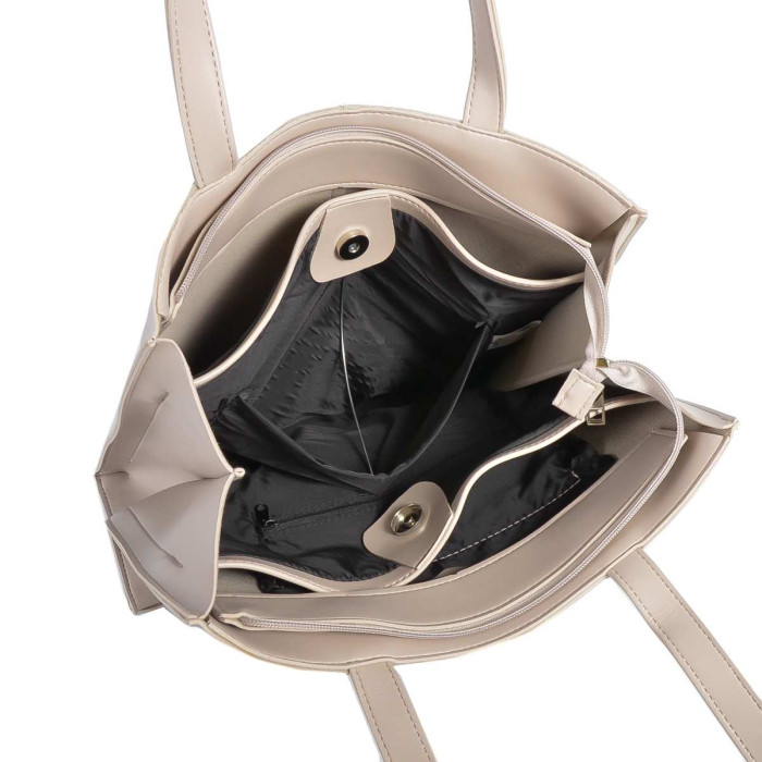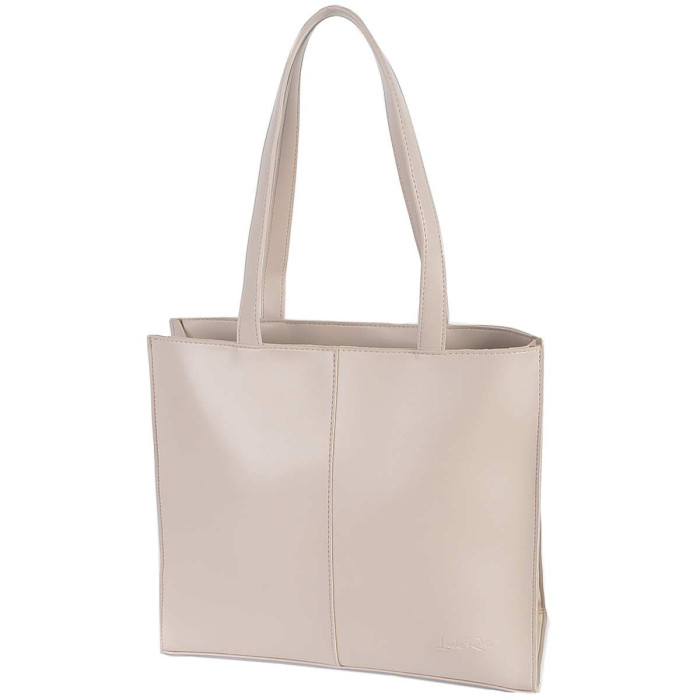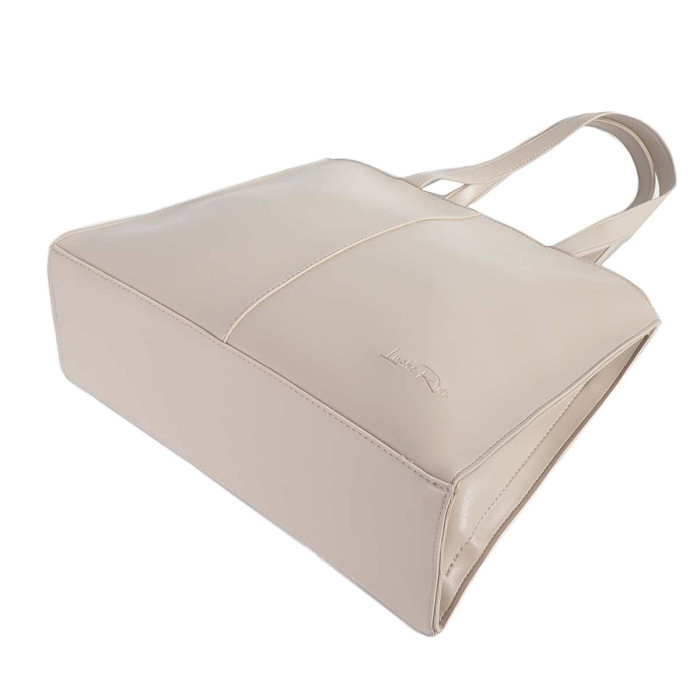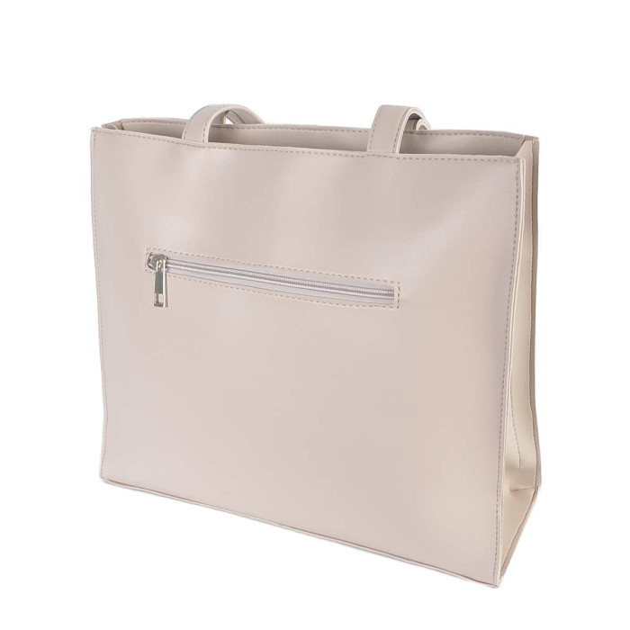 Аксесуар з двома нерегульованими зручними ручками середньої довжини, які закріплені металевими пуклями. Перевагою стане комбінація двох кольорів, які не тільки візуально прикрашають виріб, а і захищають внутрішню сторону ручок від вираженого забруднення. Великі прямокутні форми сумки з легкістю розміщують документи формату А4. Дно укріплене та оснащене металевими ніжками, що мінімізує просідання та пошкодження. На тильній зовнішній стороні розміщена врізна кишеня на блискавці.