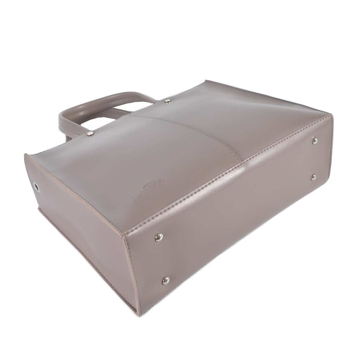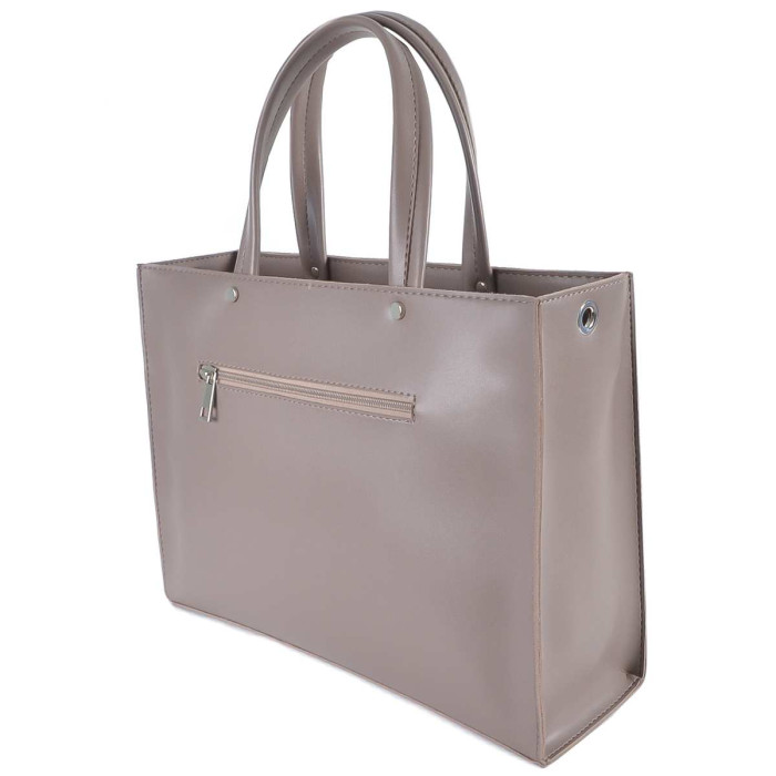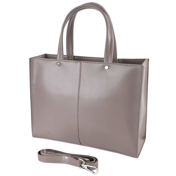 Сумку, з простим кроєм та мінімальним оздобленням, виконано з шкірозамінника високої якості, щоб її використання було максимально тривалим та приємним. Основна увага акцентується на гарній текстурі шкірзамінника ззовні, який з внутрішньої сторони має оригінальне покриття імітоване під велюр. Сумочка має дві короткі ручки, які розраховані на комфортне транспортування в руці. До комплекту входить довгий регульований ремінець. Задня стінка оснащена врізною кишенею на застібці. На дні встановлені металеві ніжки. Весь виріб зачиняється на блискавку.