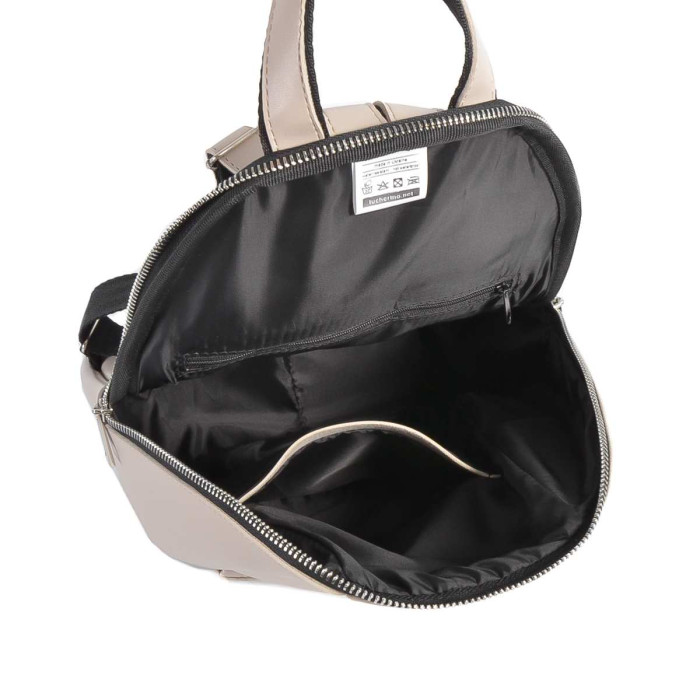 Рюкзак має одне основне відділення, яке застібається блискавкою. Горизонтально розташована кишенька на передній зовнішній стінці дуже зручна та практична у використанні. В середині розміщена потайна кишенька на застібці та невелика кишенька для всіляких дрібниць. Підкладка тільки з міцної текстильної тканини.