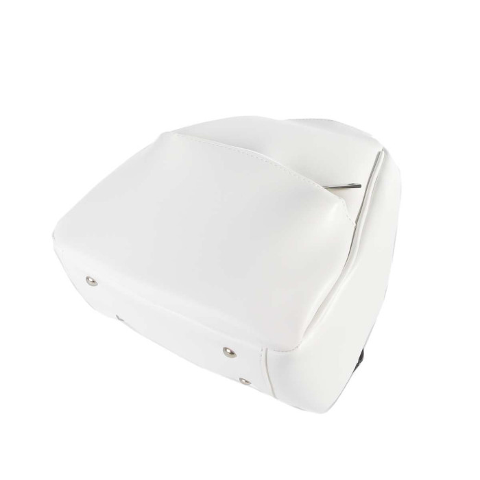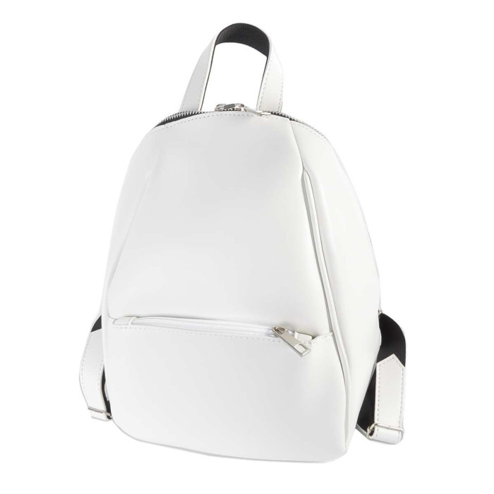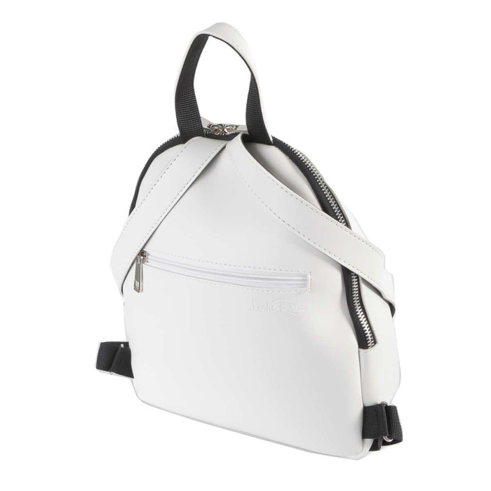 Виріб виконаний з високоякісного шкірозаміника з легким відблиском. Завдяки заокругленим формам дуже гарний візуально та приємний на дотик, а середні розміри роблять виріб дуже вмістким та зручним. Зміцнене дно на металевих ніжках запобігатиме просіданню та пошкодженням під час експлуатації. Наявні стаціонарні ремінці, які можна відрегулювати під потрібний розмір. У верхній частині також пришита маленька ручка для транспортування в руці. Задня панель рюкзачка м'яка, не потовщена.