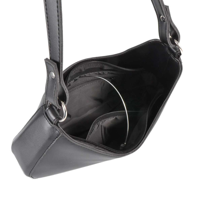 Сумка на одне загальне відділення. Не дивлячись на невеликі розміри, сумочка виявилась достатньо вмісткою. Весь виріб зачиняється на блискавку. Довгий ремінь з можливість регулювання довжини виготовлений з шкірзаміннику. На задній стінці вмонтована кишеня, яка зачиняється на блискавку.