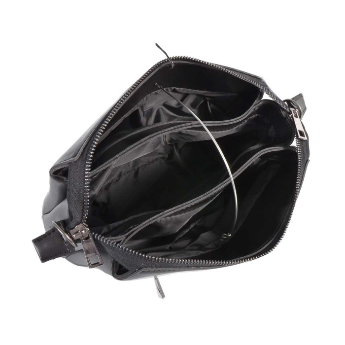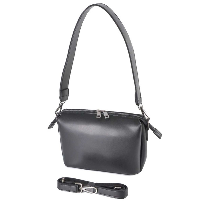 Сумка на три відділення з додатковими кишеньками. Не дивлячись на невеликі розміри, сумочка виявилась достатньо вмісткою. Весь виріб зачиняється на блискавку. Довгий ремінь з можливістю регулювання довжини та короткий - для зручності. Ремені кріпляться на карабіни. На задній стінці вмонтована кишеня, яка зачиняється на блискавку. На дні встановлені металеві ніжки, які будуть захищати від пошкоджень.