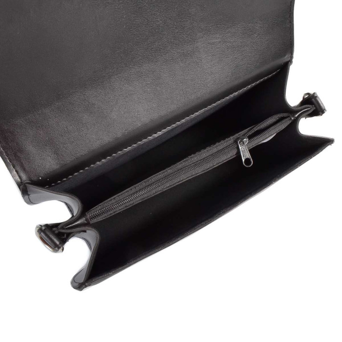 Весь виріб зачиняється на блискавку, яка накривається клапаном на магнітній кнопці. Сумочка має довгий ремінець, який можна відрегулювати під потрібний розмір, для легкого транспортування через плече.