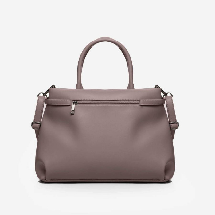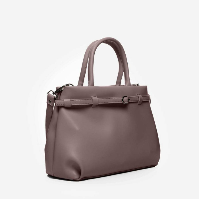 Сумку, з простим кроєм та мінімальним оздобленням, виконано з шкірозамінника високої якості, щоб її використання було максимально тривалим та приємним. Основна увага акцентується на гарній текстурі шкірзамінника ззовні, який з внутрішньої сторони має оригінальне покриття імітоване під велюр. Сумочка має дві короткі ручки, які розраховані на комфортне транспортування в руці. До комплекту входить довгий регульований ремінець. Задня стінка оснащена врізною кишенею на застібці. На дні встановлені металеві ніжки. Весь виріб зачиняється на блискавку.
