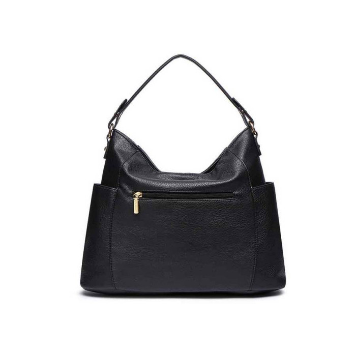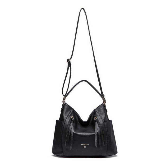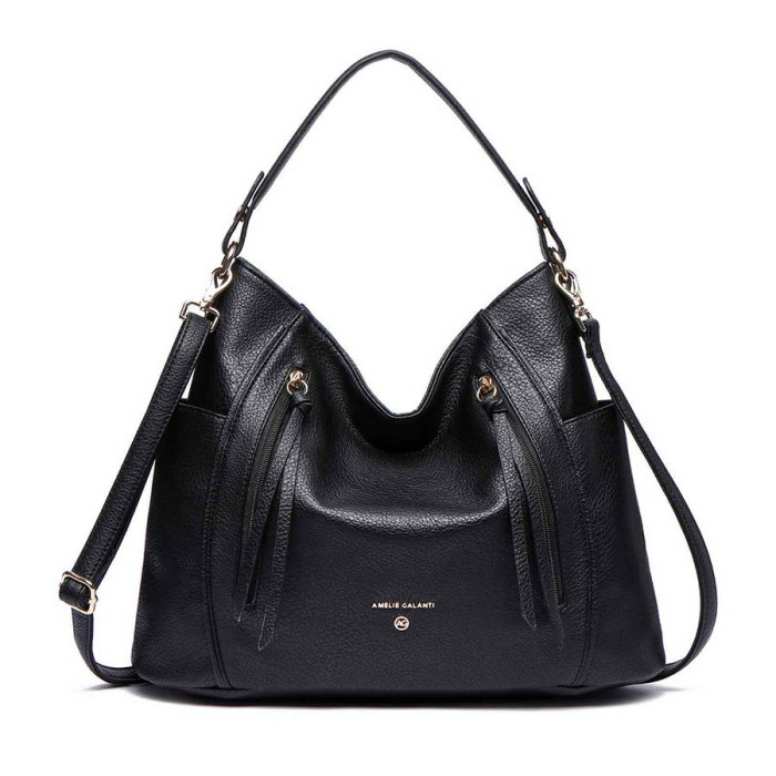 Розміри (X * Y * Z): 38 (замір по дну) х 26 х 12 см. Колір: чорний. Колір фурнітури: золото. Матеріал: шкірзамінник. Матеріал підкладки: тканина. Кількість основних відділень: 1. Всередині є 1 кишеня на блискавці і 2 накладних. На лицьовій стороні є дві Вертикальні кишені на блискавках. На тильній стороні сумки є 1 прорізна кишеня на блискавці. Сумка має дві бічні кишені. Також сумка має знімну ручку для перенесення в руці, їх довжина становить 39 см. У комплекс входить плечовий ремінь, довжина якого становить 128 см. Аксесуар можна носитив руці, на плечі або через плече. Модель закривається за допомогою блискавки. Документи формату А4 не поміщаються в сумку. Сумка упакована в поліетиленовий пакет. Країна походження торгової марки AMELIE GALANTI і країна-виробник-Китай. Гарантія: 1 місяць.