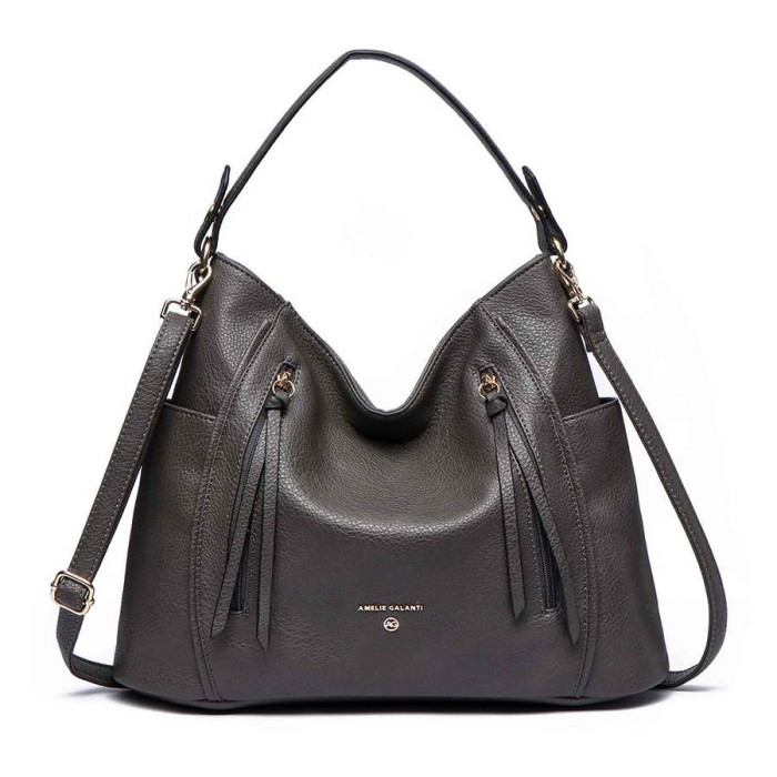 Розміри (X * Y * Z): 38 (замір по дну) х 26 х 12 см. Колір: сірий. Колір фурнітури: золото. Матеріал: шкірзамінник. Матеріал підкладки: тканина. Кількість основних відділень: 1. Всередині є 1 кишеня на блискавці і 2 накладних. На лицьовій стороні є дві Вертикальні кишені на блискавках. На тильній стороні сумки є 1 прорізна кишеня на блискавці. Сумка має дві бічні кишені. Також сумка має знімну ручку для перенесення в руці, їх довжина становить 39 см. У комплекс входить плечовий ремінь, довжина якого становить 128 см. Аксесуар можна носитив руці, на плечі або через плече. Модель закривається за допомогою блискавки. Документи формату А4 не поміщаються в сумку. Сумка упакована в поліетиленовий пакет. Країна походження торгової марки AMELIE GALANTI і країна-виробник-Китай. Гарантія: 1 місяць.
