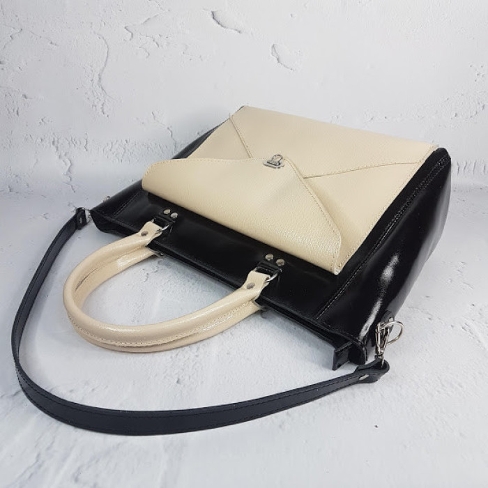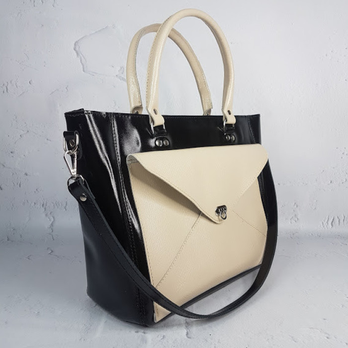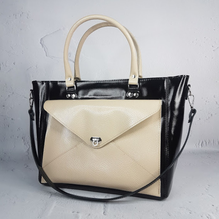 Сумка на підкладці, всередині є кишеня на блискавці. Плечовий ремінь подвійний, не регулюється. Зовні знаходиться конверт-кишеня на поворотному замку.