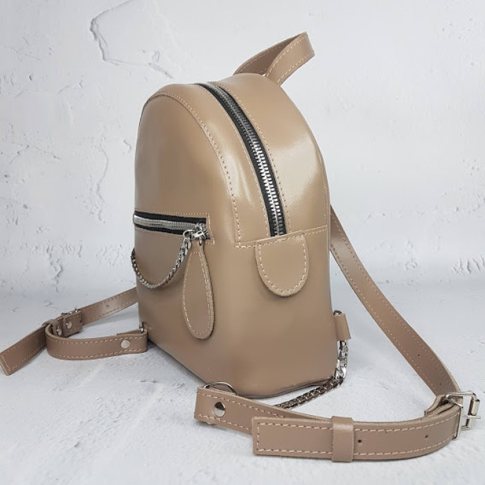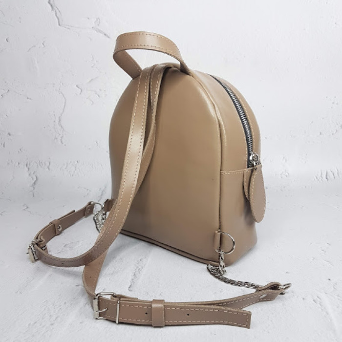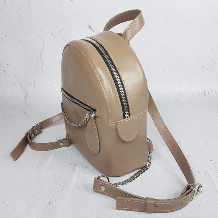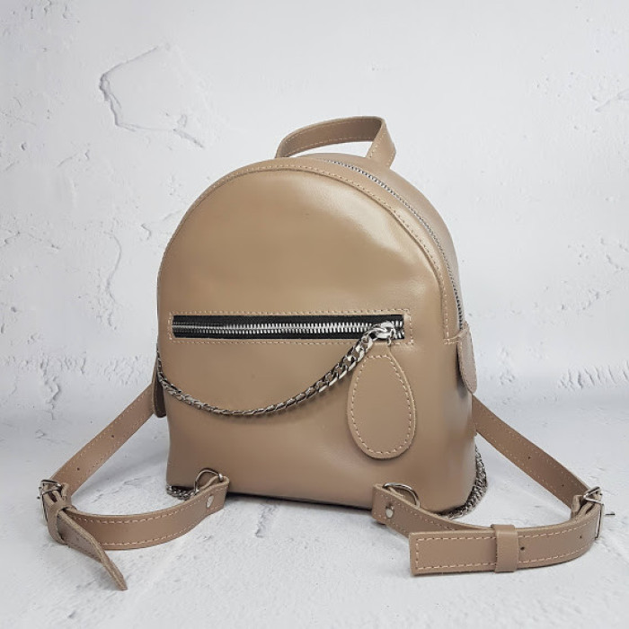 Неймовірно зручний рюкзак з якісної натуральної шкіри. Відмінно тримає форму і дуже місткий. Ланцюжок надає рюкзачку оригінальність. Має одне велике відділення, всередині рюкзака є відкрита кишеня.