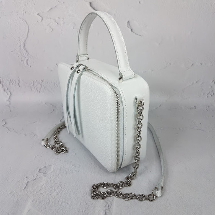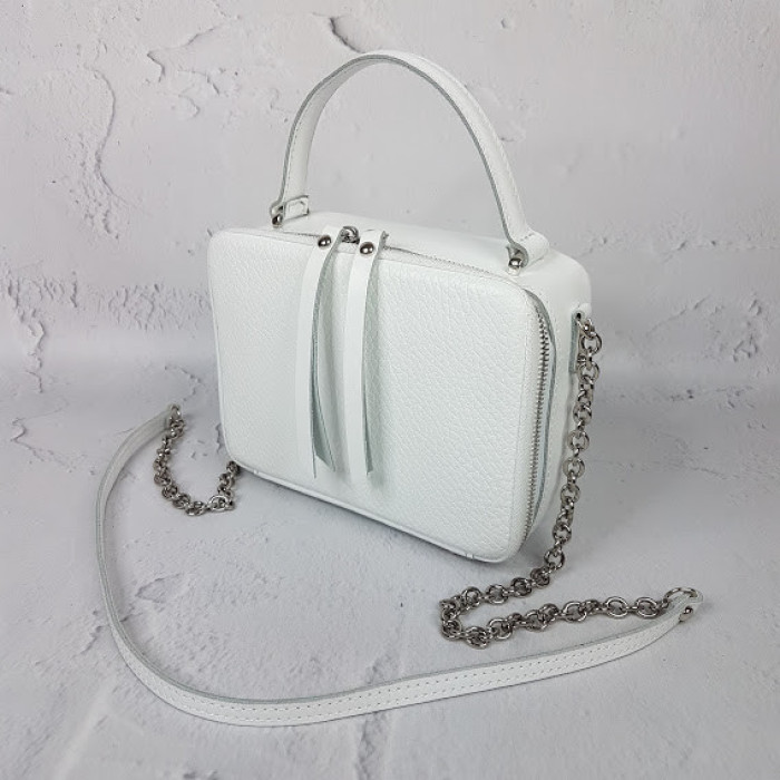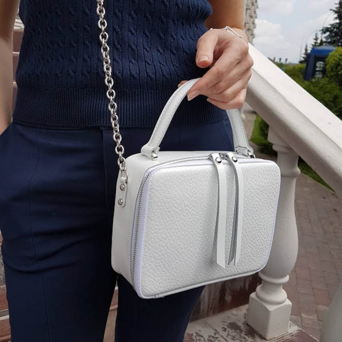 Модель сумочки з натуральної шкіри "КВАДРО" чудово тримає форму та помістить у себе все необхідне, що треба взяти із собою! Має невелику внутрішню кишеньку 14*10. Ремінь із ланцюжка зі шкіряною вставкою для плеча.