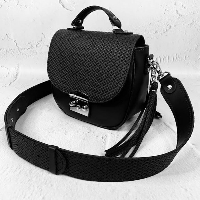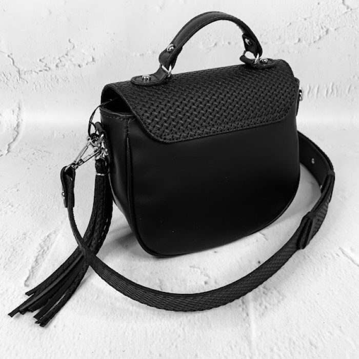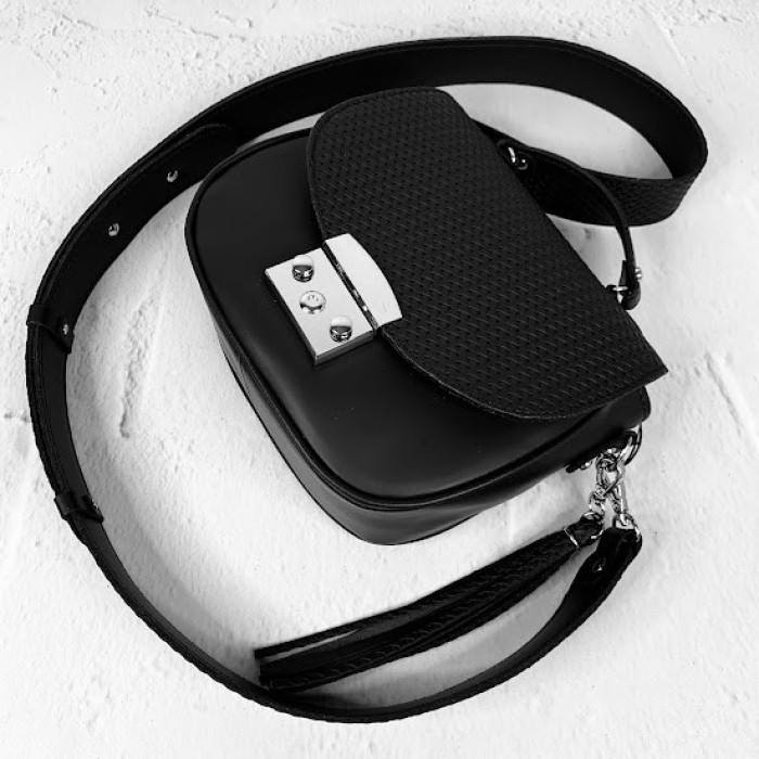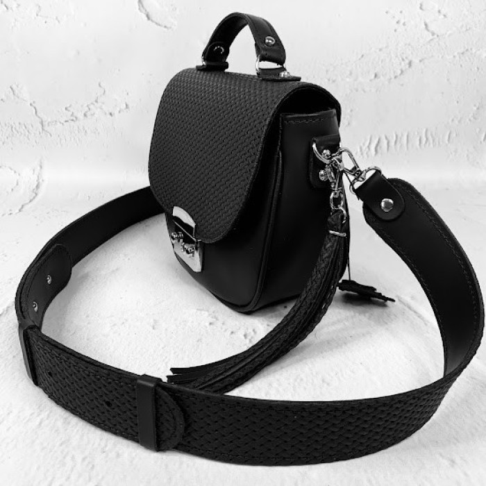 Найпопулярніша наша модель маленьких сумочок. Сумка на підкладці, закривається на замочок-засувку з кнопками, всередині є кишеня на блискавці. Плечовий ремінь сумки регулюються. У формі прикраси на карабіні кріпиться шкіряний пензлик.