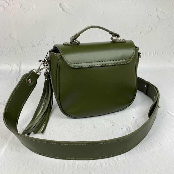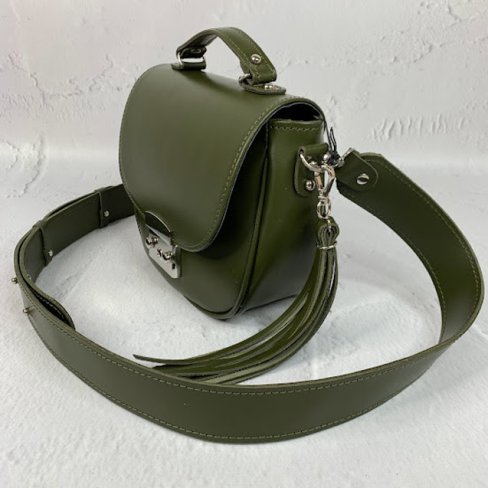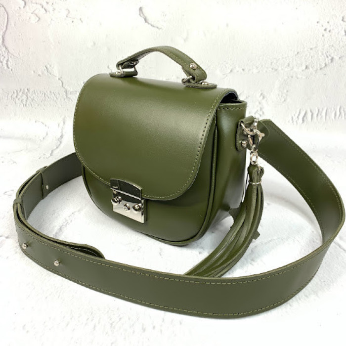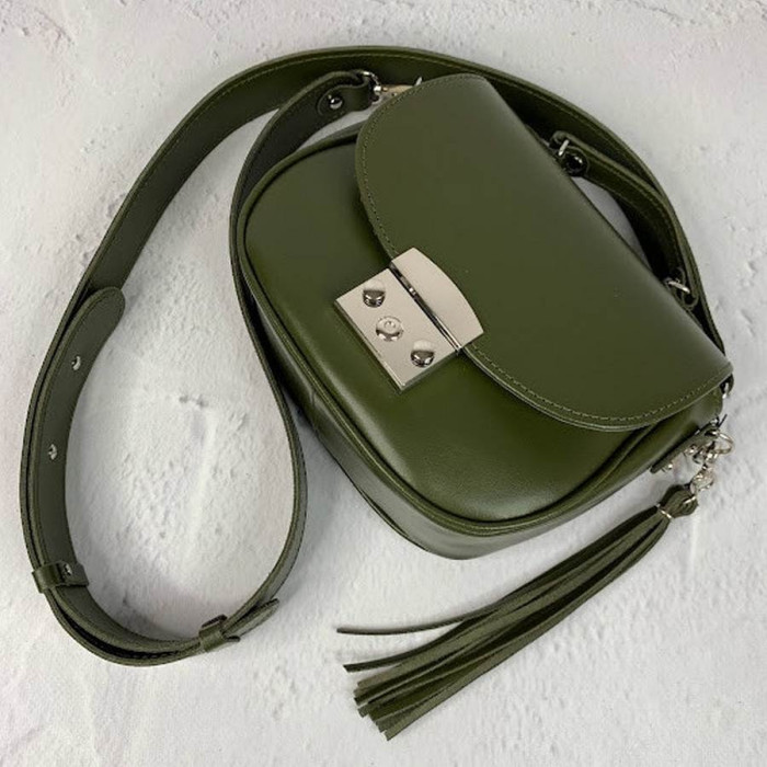 Найпопулярніша наша модель маленьких сумочок. Сумка на підкладці, закривається на замочок-засувку з кнопками, всередині є кишеня на блискавці. Плечовий ремінь сумки регулюються. У формі прикраси на карабіні кріпиться шкіряний пензлик.