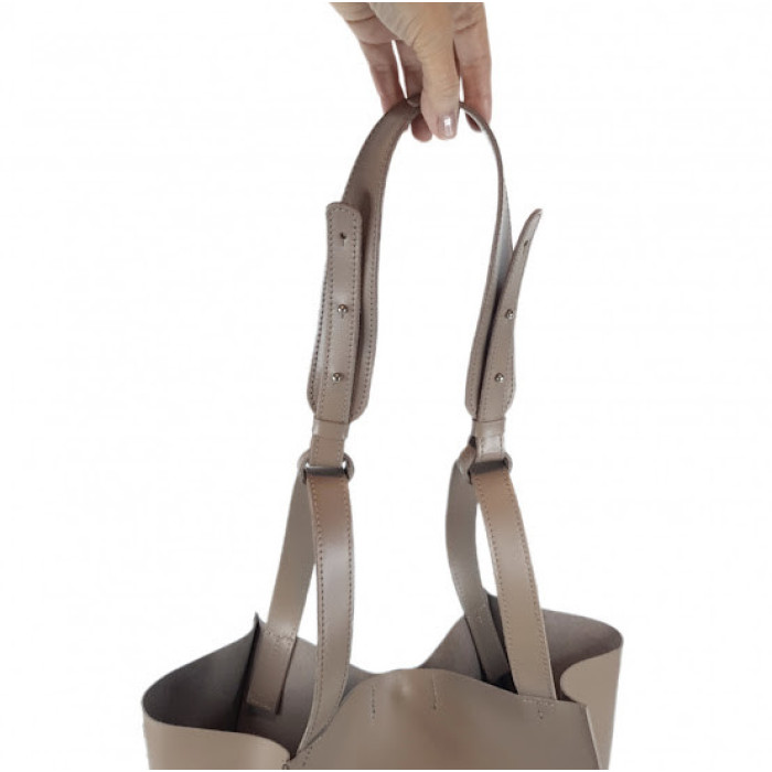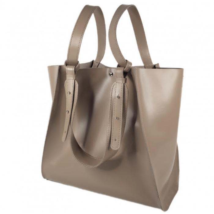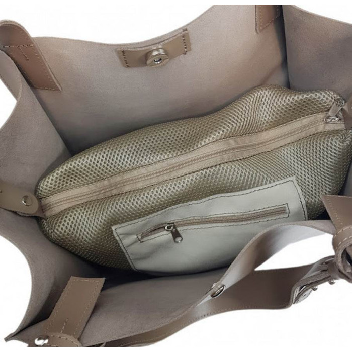 Містка сумка-шопер виготовлена з натуральної шкіри. Усередині основного відділення є тканинний кофр на блискавці, який кріпиться до сумки на кнопку за допомогою шкіряного ремінця.