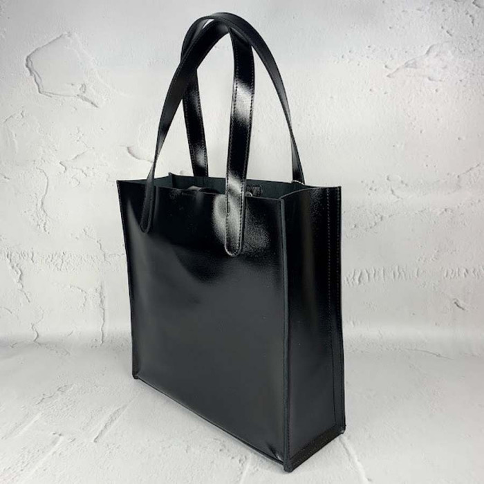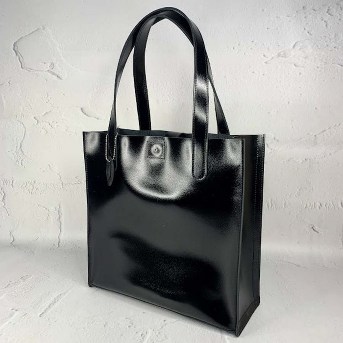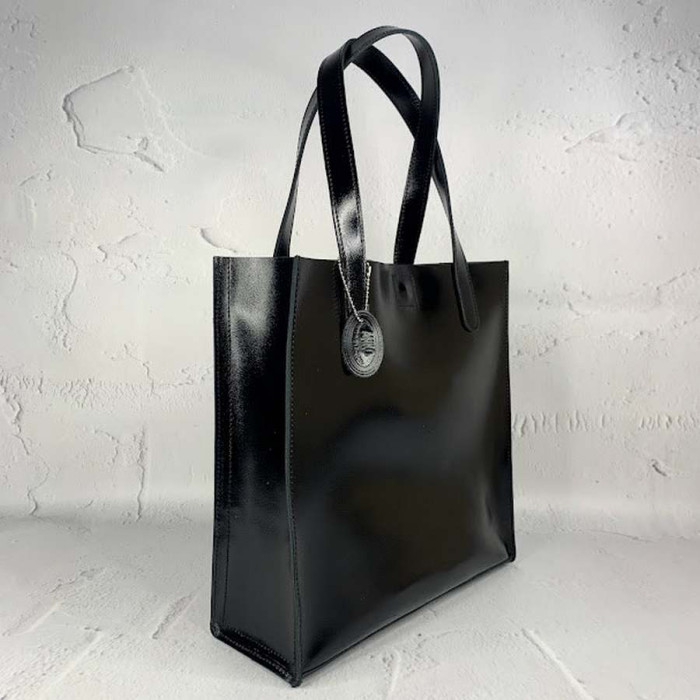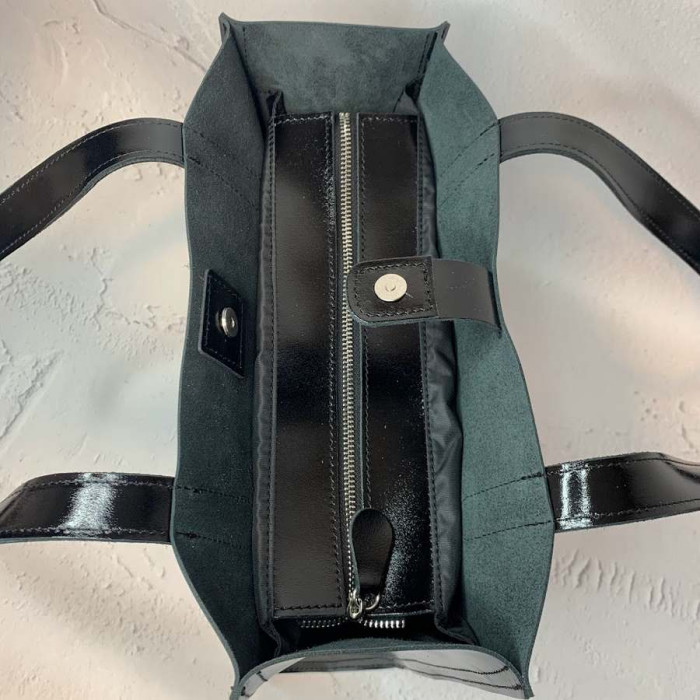 Містка сумка з натуральної шкіри, всередині є основне відділення з відкритою кишенею, яке закривається на блискавку. З боків основного відділення, є дві відкритих кишені.