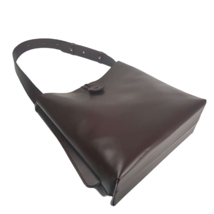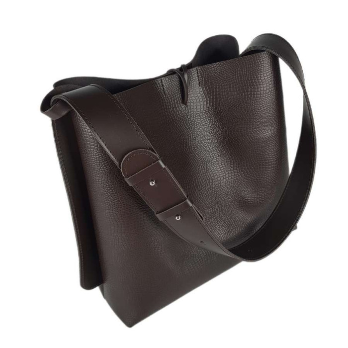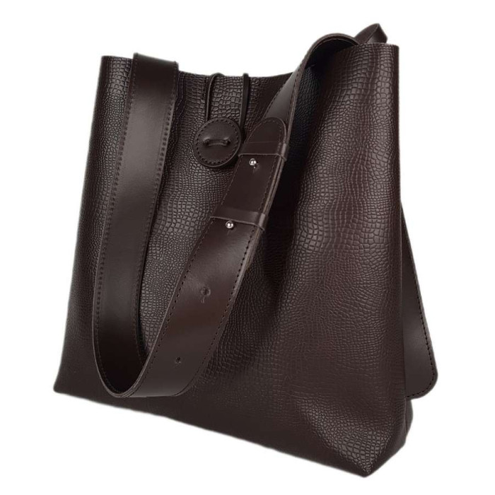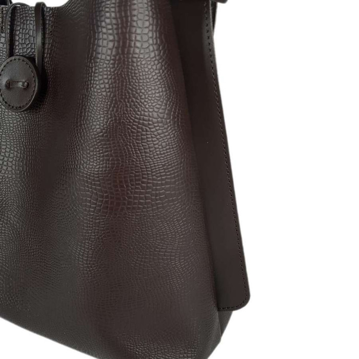 Містка сумка з натуральної шкіри, всередині спеціальне відділення - футляр з кишенею на блискавці, який кріпиться до сумки за допомогою шкіряного ремінця. Застібається на декоративний гудзик. Довжина ременя регулюється.