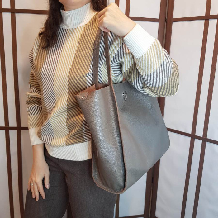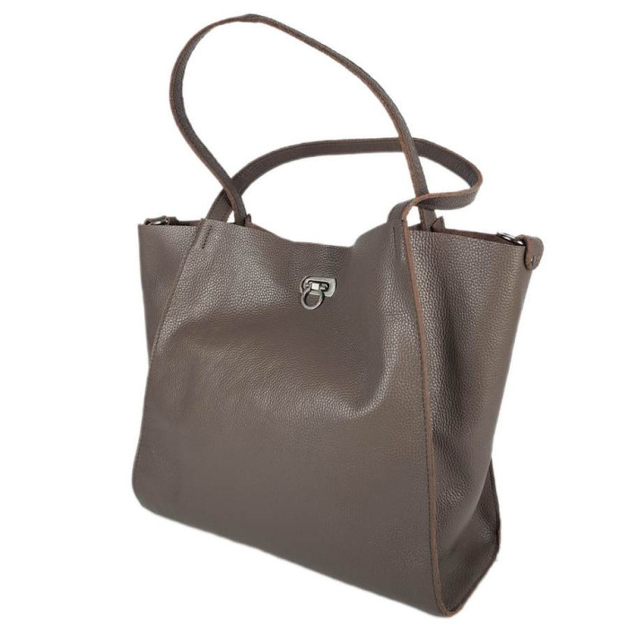 Містка сумка-шопер виготовлена з натуральної шкіри. Усередині основного відділення є тканинний кофр на блискавці, який кріпиться до сумки на кнопку за допомогою шкіряного ремінця.
