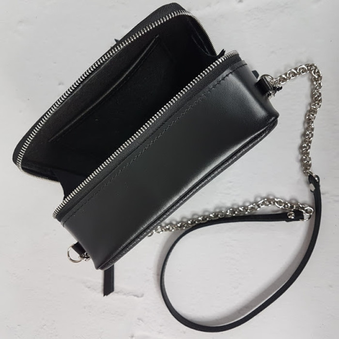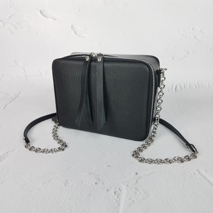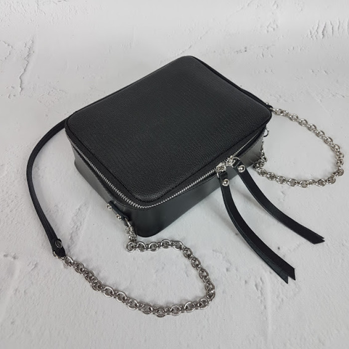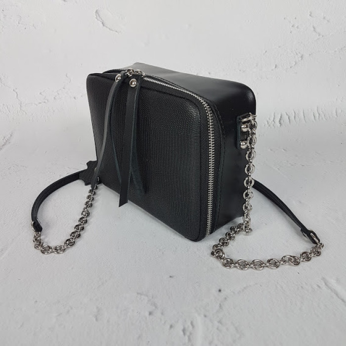 Дуже оригінальна сумочка з натуральної шкіри "КВАДРО".Вона відмінно тримає форму і помістить в себе все необхідне, що треба взяти з собою! Особливість цієї моделі в контрастно чорній блискавці, але, якщо Ви хочете, ми можемо зробити її під колір сумки. Всередині на підкладці. Має невелику внутрішню кишеньку. Ремінець це щільний срібний ланцюг з плечовою вставкою зі шкіри.