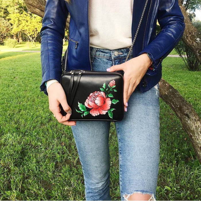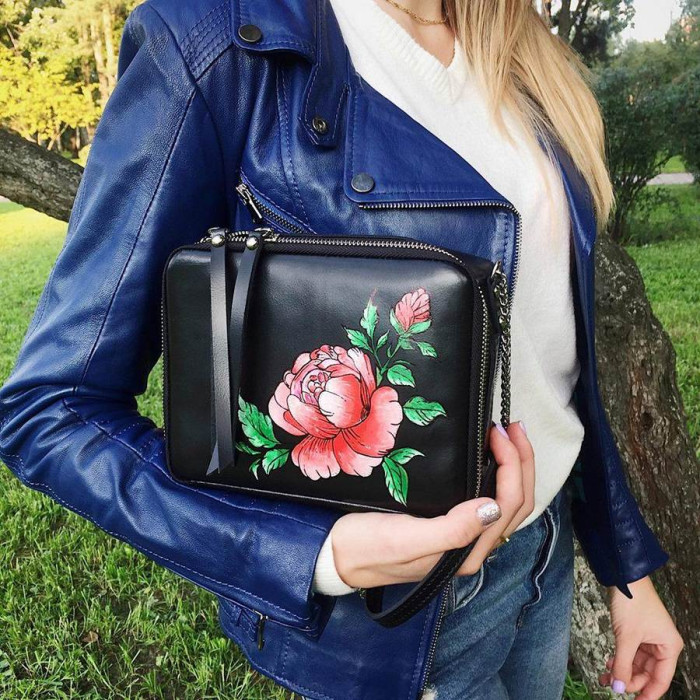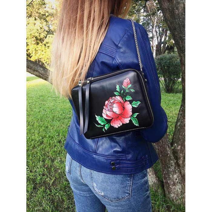 Якщо Ви цінитель ексклюзиву і оригінальності, то ми пропонуємо Вам шматочок мистецтва у вигляді всіма улюбленого і завжди запам'ятовується своїм неймовірним ароматом півонії! Ми створили для Вас неповторну сумочку з ручним розписом.Вона відмінно тримає форму і помістить в себе все необхідне, що треба взяти з собою! Всередині на підкладці. Має невелику внутрішню кишеньку. Ремінець це щільний срібний ланцюг з плечовою вставкою зі шкіри.