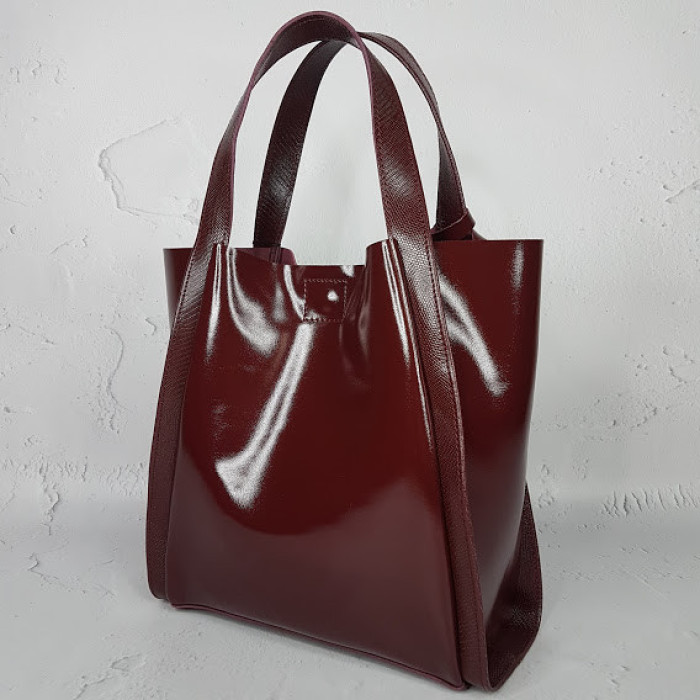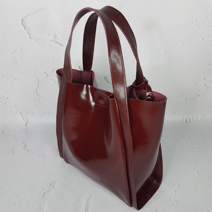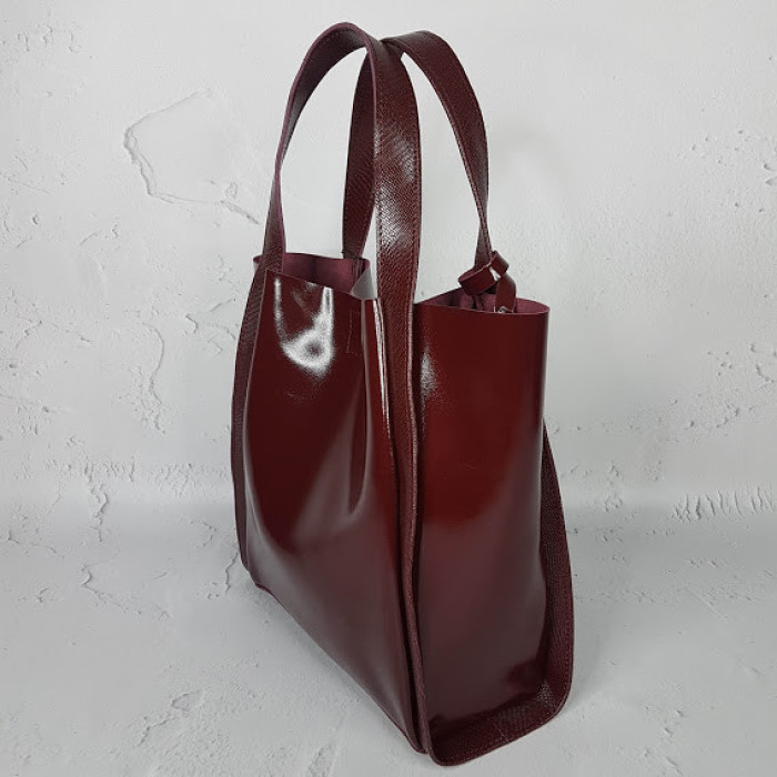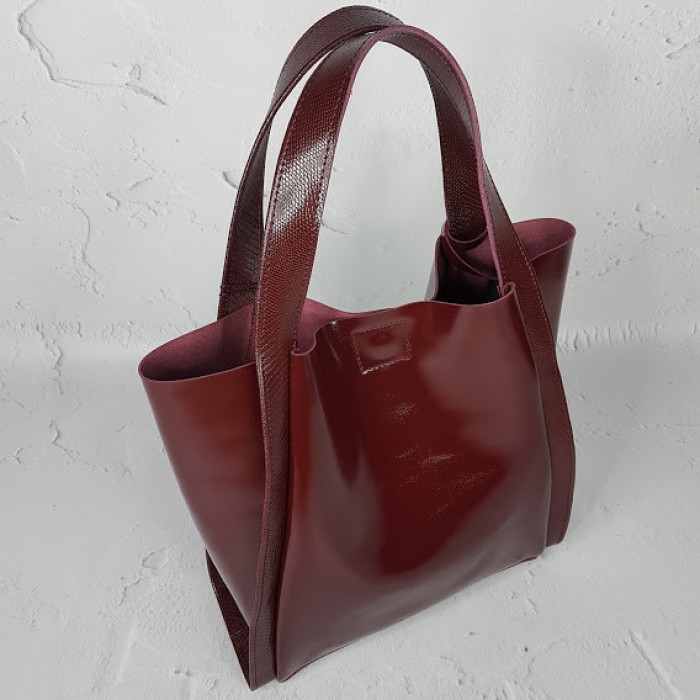 Містка сумка з натуральної шкіри, всередині спеціальне відділення - футляр, яке кріпиться до ручки сумки за допомогою шкіряного ремінця. Можливо виготовити сумку на блискавки і на підкладці. Ручки сумки можемо подовжити за Вашим бажанням. Застібається на прихований магніт. Розмір сумки: 27 * 32 * 11