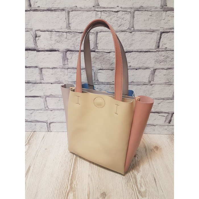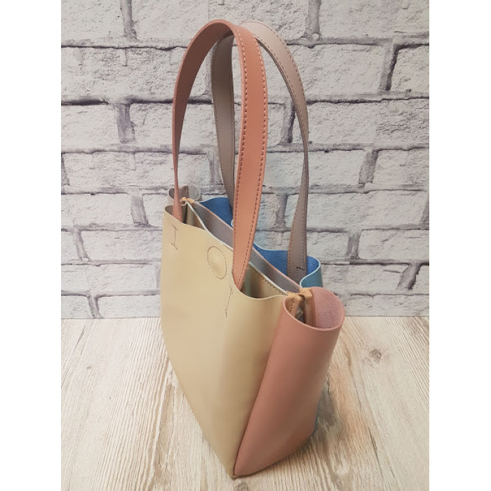 Дуже оригінальна і містка сумка "Вів'єн" з натуральної шкіри. За рахунок різних кольорів її сторін, можна поєднувати з багатьма квітами в одязі. Усередині три відділення, одне центральне на блискавки і два бокових на кнопці. Сумка без підкладки. Ручки 25 см, які можемо подовжити за Вашим бажанням.