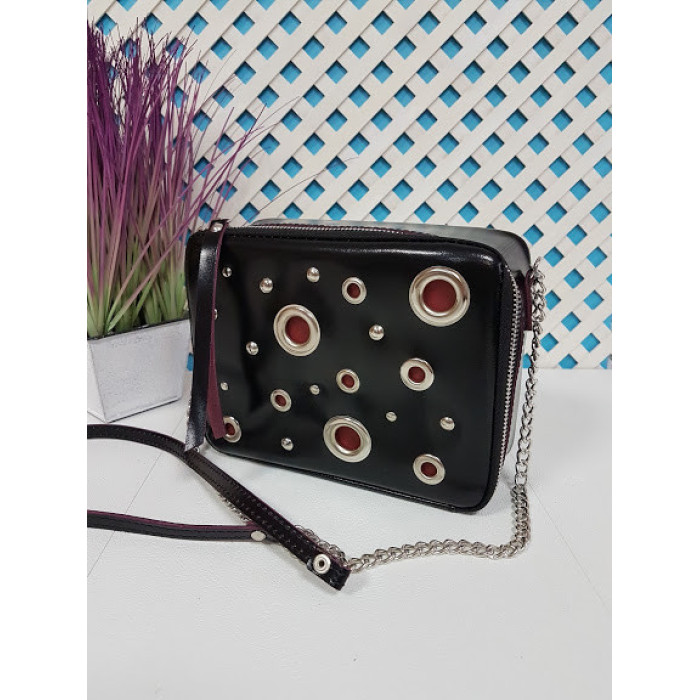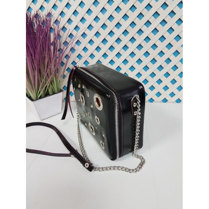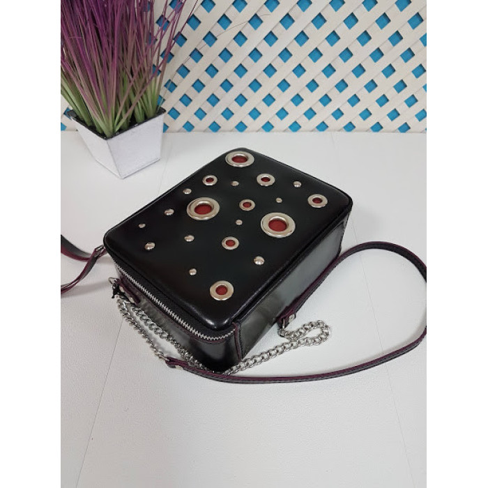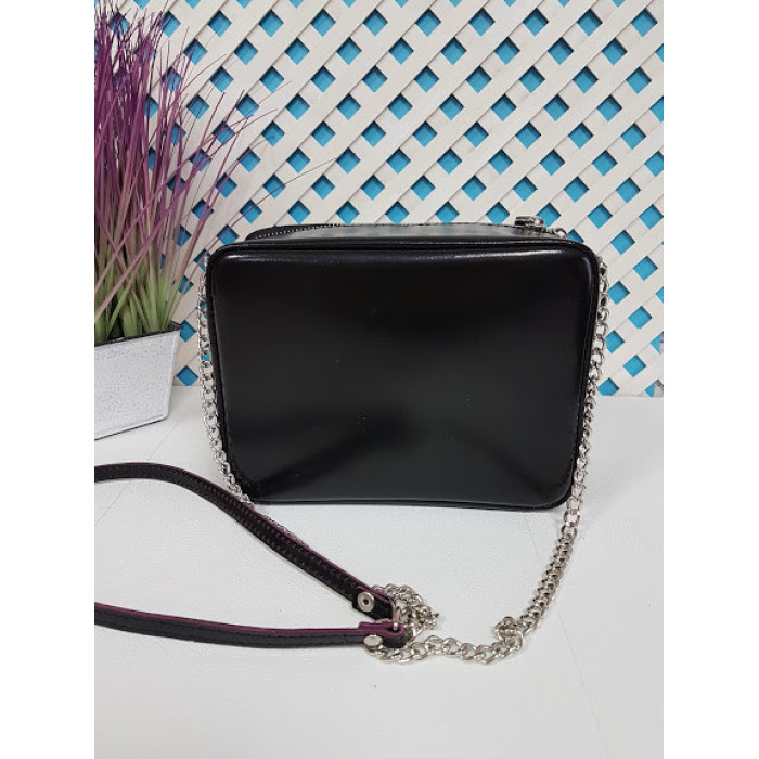 Дуже оригінальна сумочка з натуральної шкіри "КВАДРО".Вона відмінно тримає форму і помістить в себе все необхідне, що треба взяти з собою! Особливість цієї моделі в контрастно чорній блискавці, але, якщо Ви хочете, ми можемо зробити її під колір сумки. Всередині на підкладці. Має невелику внутрішню кишеньку. Ремінець це щільний срібний ланцюг з плечовою вставкою зі шкіри.