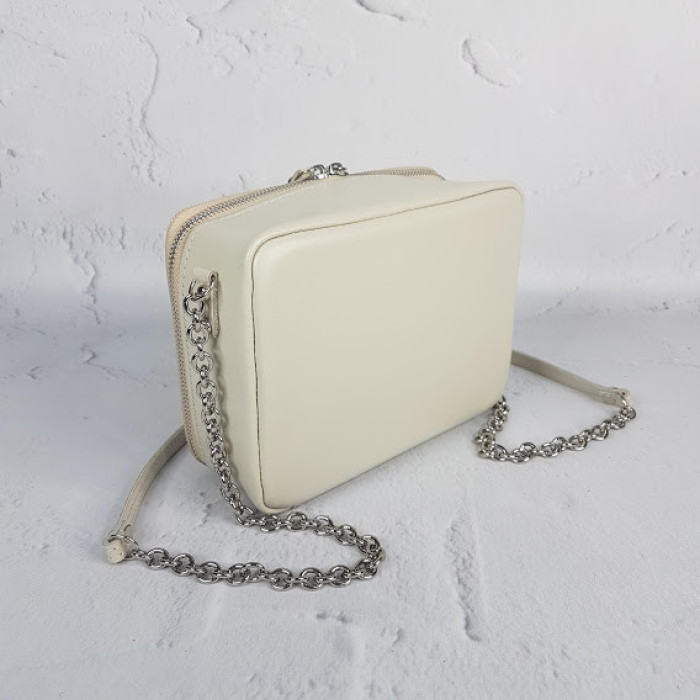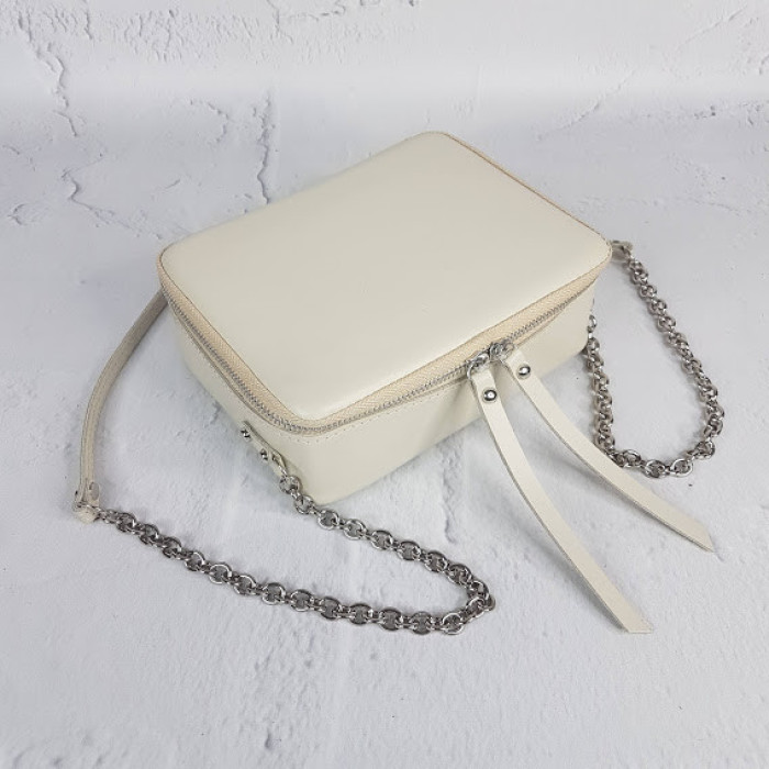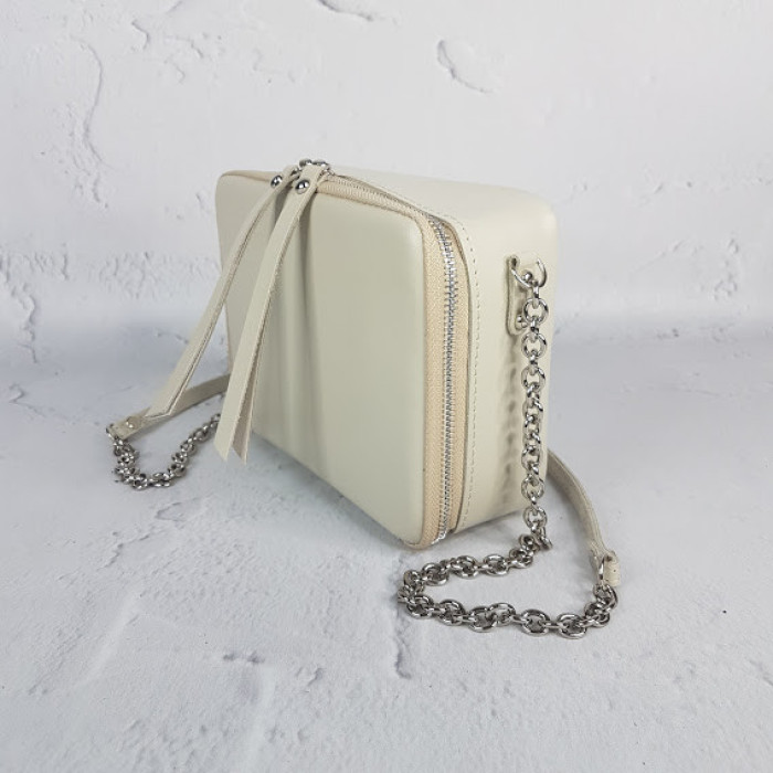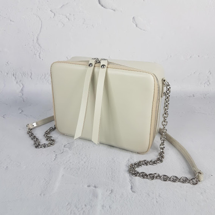 Дуже оригінальна сумочка з натуральної шкіри "КВАДРО".Вона відмінно тримає форму і помістить в себе все необхідне, що треба взяти з собою! Особливість цієї моделі в контрастно чорній блискавці, але, якщо Ви хочете, ми можемо зробити її під колір сумки. Всередині на підкладці. Має невелику внутрішню кишеньку. Ремінець це щільний срібний ланцюг з плечовою вставкою зі шкіри.