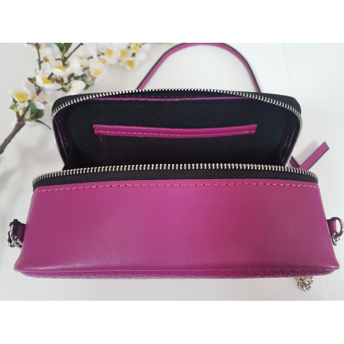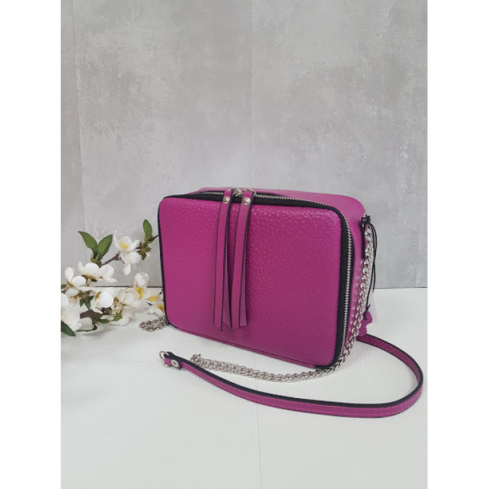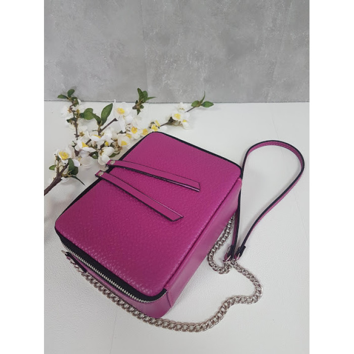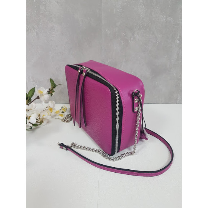 Дуже оригінальна сумочка з натуральної шкіри "КВАДРО".Вона відмінно тримає форму і помістить в себе все необхідне, що треба взяти з собою! Особливість цієї моделі в контрастно чорній блискавці, але, якщо Ви хочете, ми можемо зробити її під колір сумки. Всередині на підкладці. Має невелику внутрішню кишеньку. Ремінець це щільний срібний ланцюг з плечовою вставкою зі шкіри.
