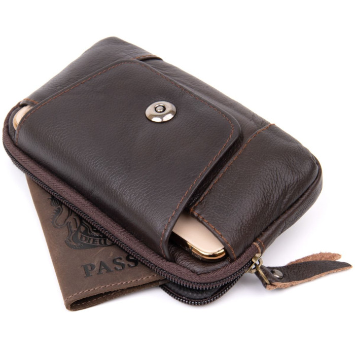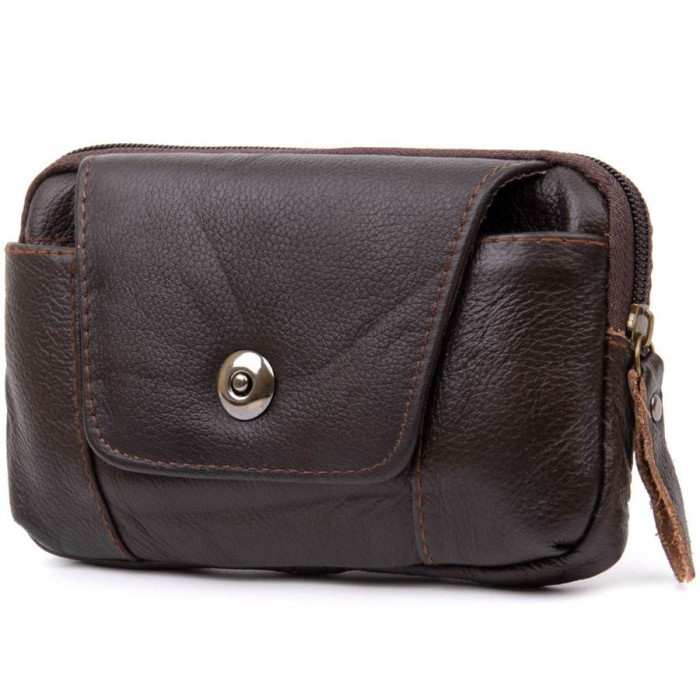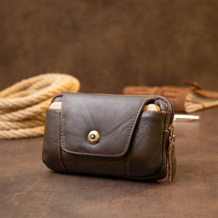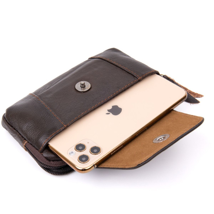 Дуже компактна чоловіча барсетка з натуральної шкіри насиченого коричневого кольору. Аксесуар можна носити на поясі за петельку на тильній стороні. Незважаючи на свій маленький розмір барсетка досить функціональна. Сумка м'яка і приємна на дотик. У барсетці ви зможете носити ваші особисті речі (телефон, гаманець, документи). З такою сумочкою вони будуть в одному місці і в безпеці. Сумка стане прекрасним подарунком для ваших близьких.