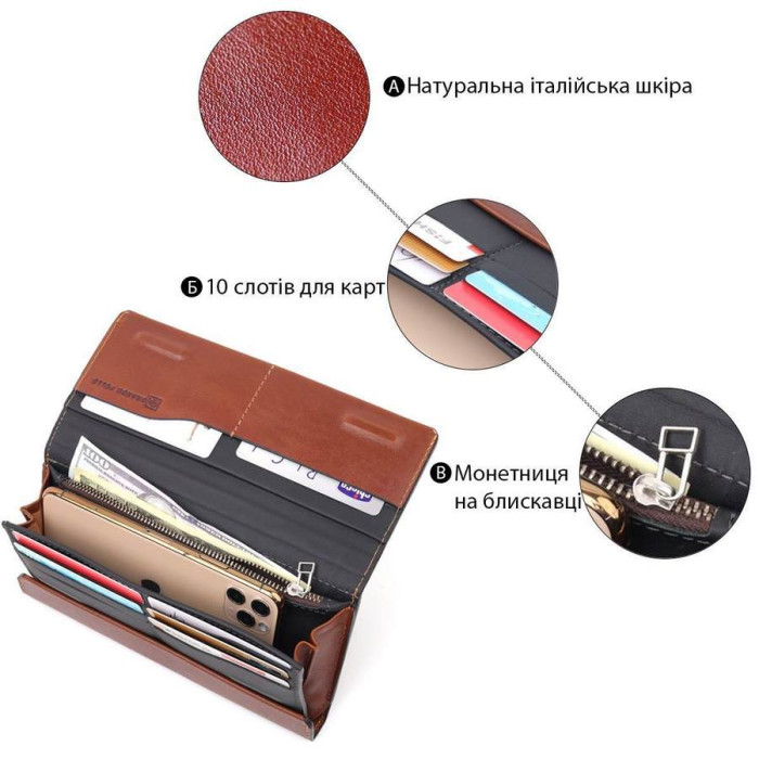 Оригінальна барсетка з італійської гладкої шкіри найвищої якості у класичному чорному кольорі всередині та в красивому коричневому кольорі зовні. Дизайн виробу не залишить вас байдужим. Елітна шкіра, якісна фурнітура – все це підкреслює справді якісну річ. Варто відзначити, що всередині аксесуар виконаний також із натуральної шкіри. Барсетка носиться у руках чи сумці. Впевнені, що такий подарунок оцінить будь-який чоловік.
