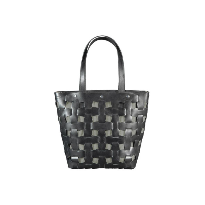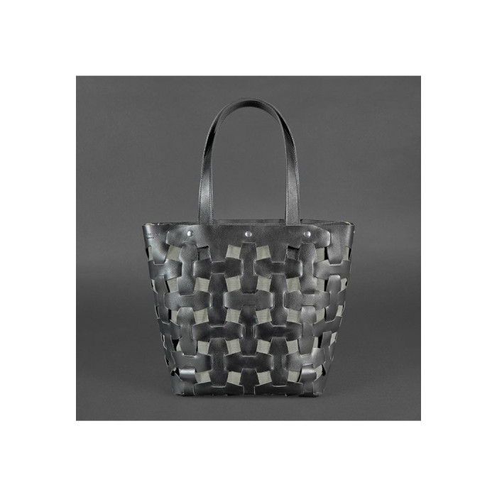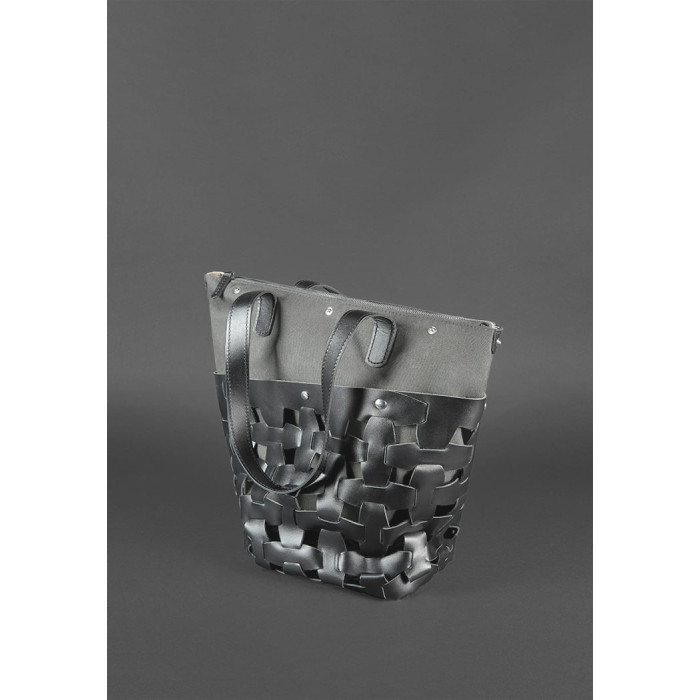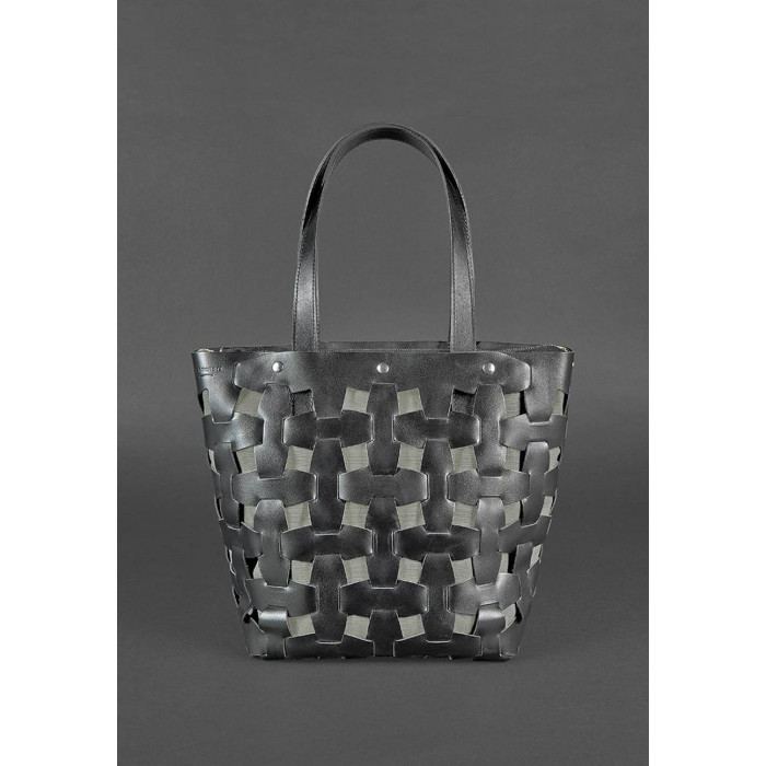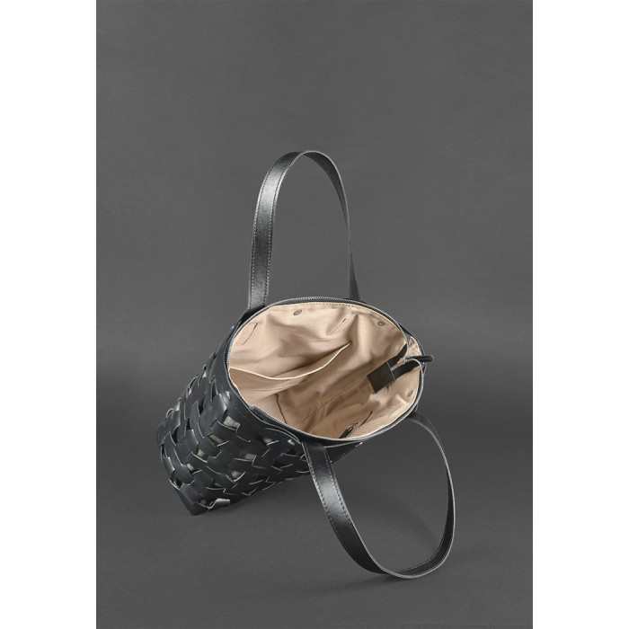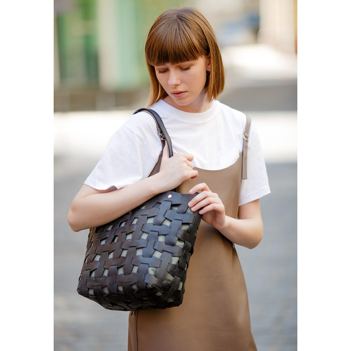 Верхня частина сумки виконана з натуральної шкіри Krast в насиченому чорному кольорі. Шкіряні смужки, сполучені по принципу пазла, формують стильне плетіння. А внутрішня сумка з міцного і вологостійкого текстилю Cordura надійно захищає внутрішнє вміст аксесуара.