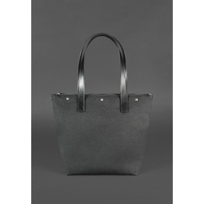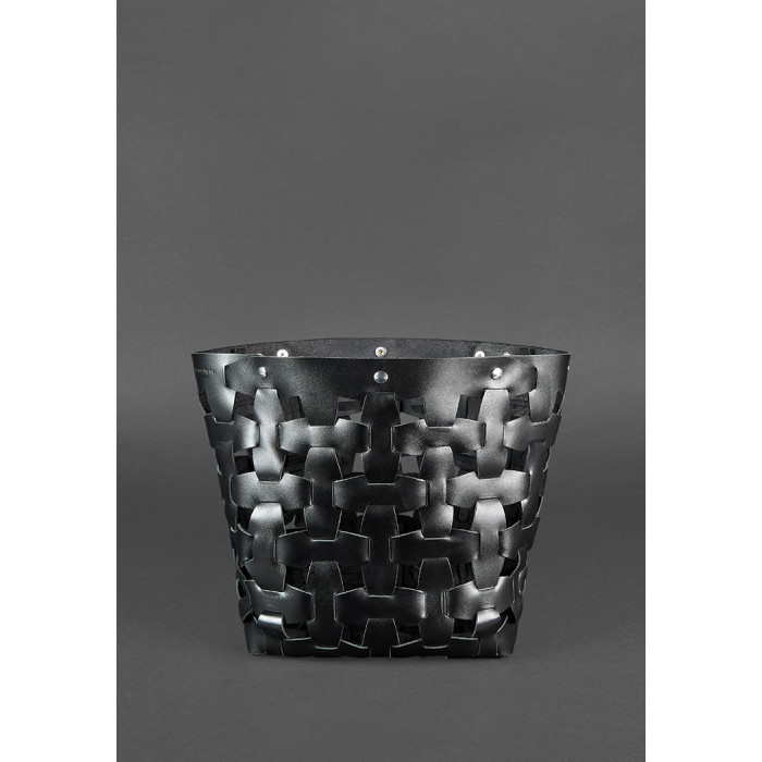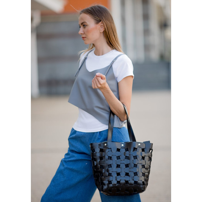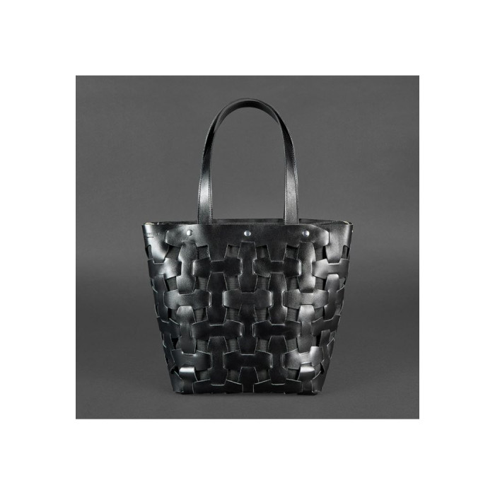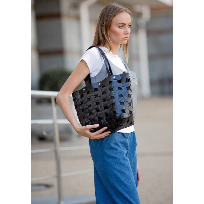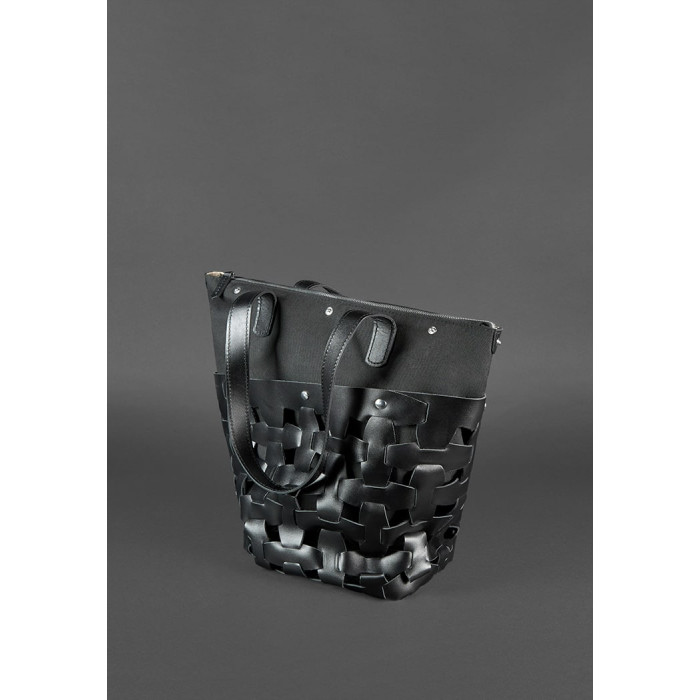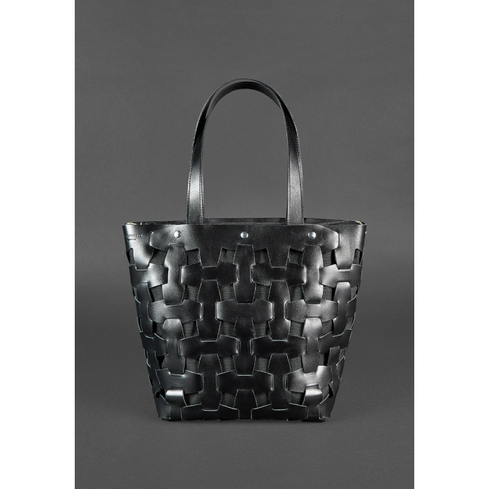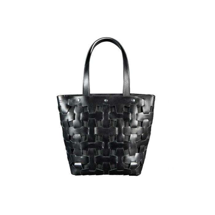 Стильний шоппер середнього розміру стане оригінальним доповненням повсякденного образу. Аксесуар виконаний з натуральної гладкої шкіри насиченого чорного кольору. Шкіряні смужки з'єднуються за принципом пазлів, формують верхній каркас сумки.