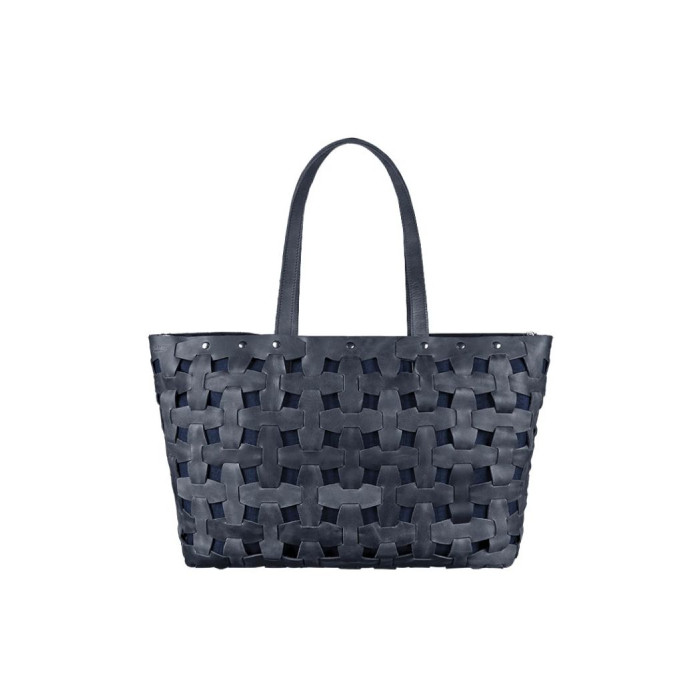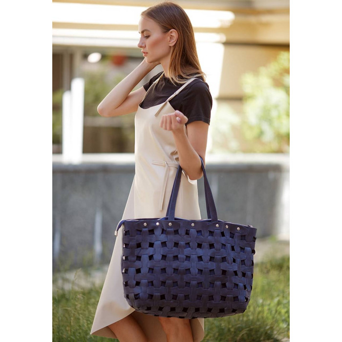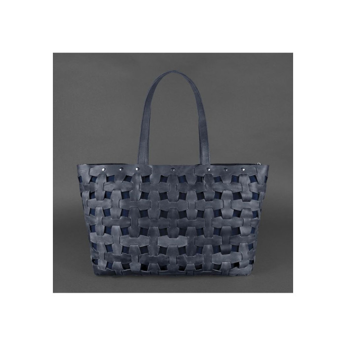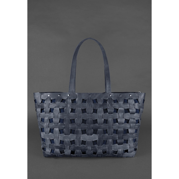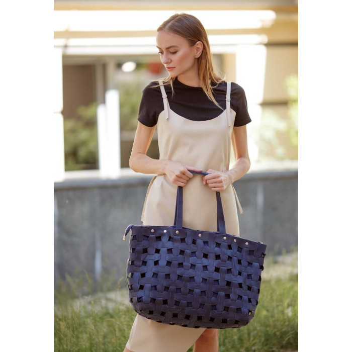 Шкіряна плетена сумка в темно-синьому кольорі безумовно сподобається любителькам стильних і оригінальних речей. Виконана сумка-шоппер з натуральної шкіри Crazy Horse в кольорі нічне небо. Смужки шкіри з'єднуються за принципом пазлів, формуючи гарне плетиво зовнішнього каркаса, сумки.
