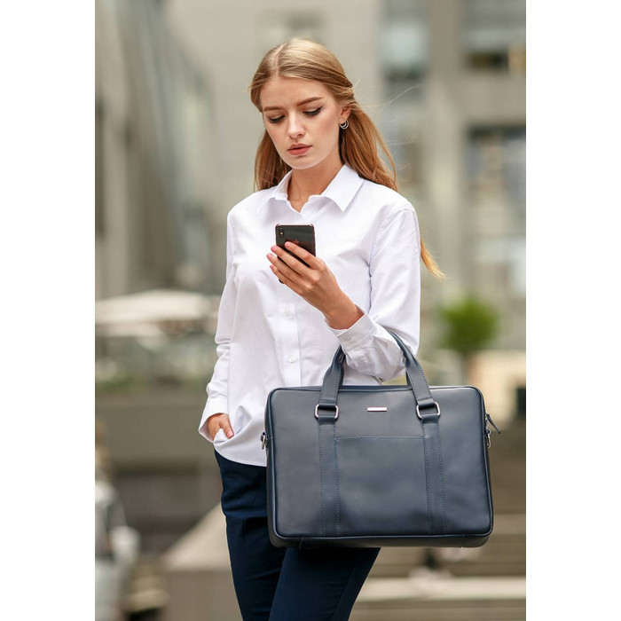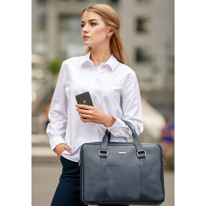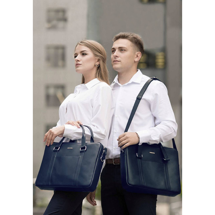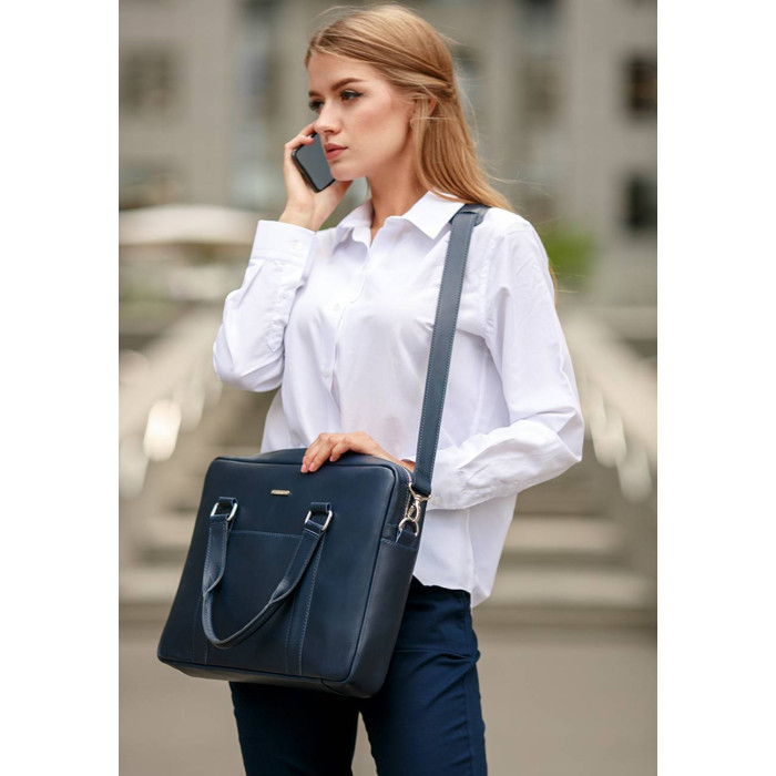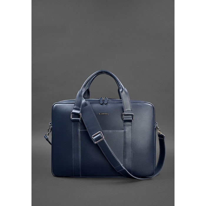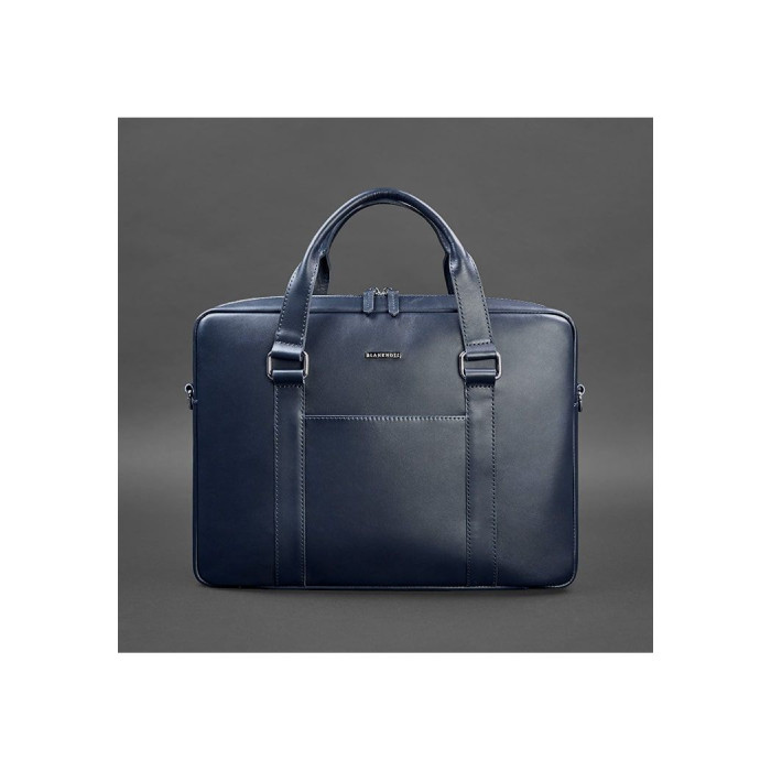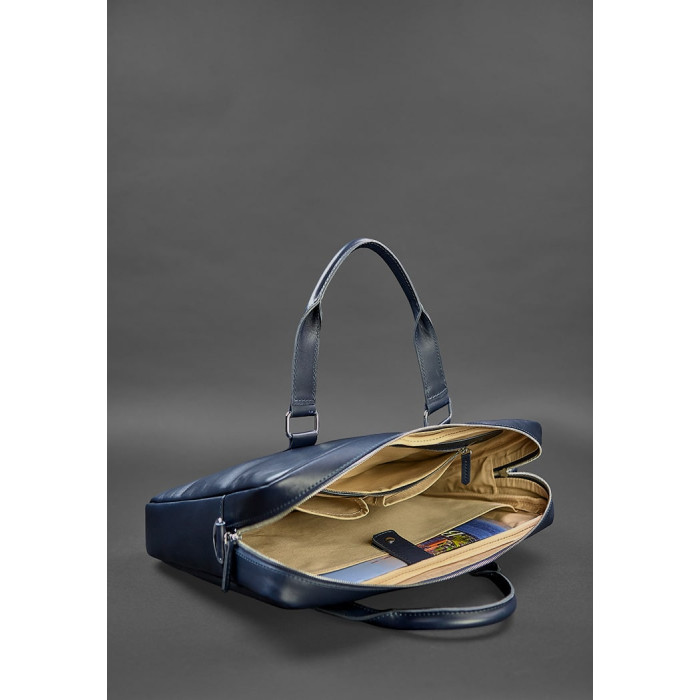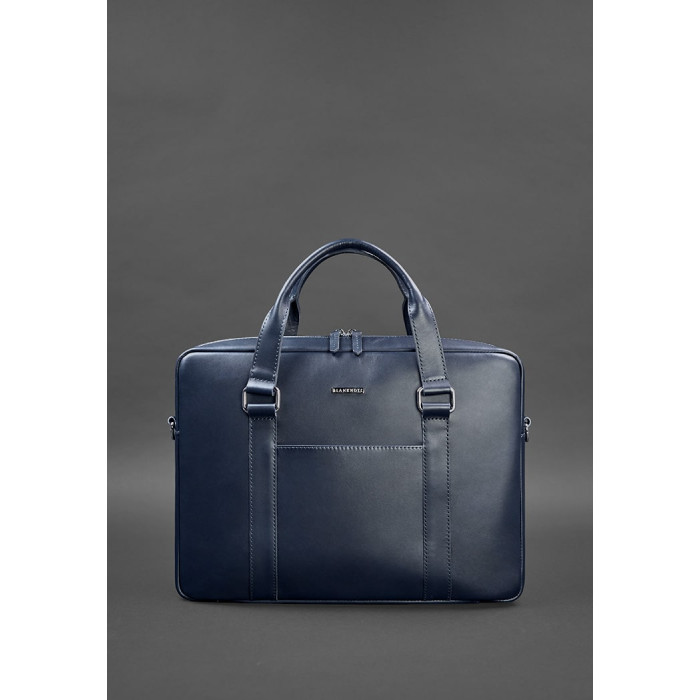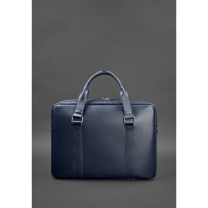 Стильна сумка для ноутбука і документів в темно-синьому кольорі сподобатися і чоловікам, і жінкам. Виготовлена сумка з натуральної шкіри краст. Ця шкіра радує гарною глянцевою текстурою, стійким кольором і високою якістю. Всі шви прошиті вручну міцними нитками. Всередині якісна текстильна підкладка.