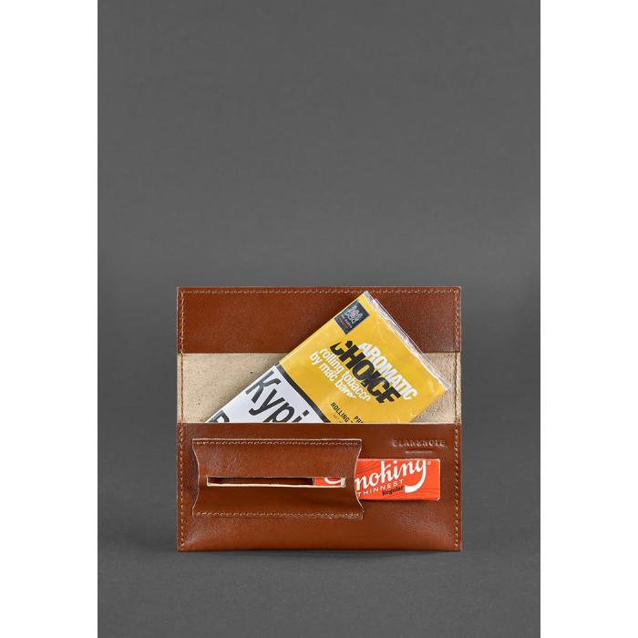 Виготовлений кисет з натурально шкіри Krast. Це досить щільна і міцна шкіра, яка відмінно тримає форму. Усередині є велике відділення для тютюну і невелика кишенька для паперу і фільтрів. Закривається стильний аксесуар на хлястик.