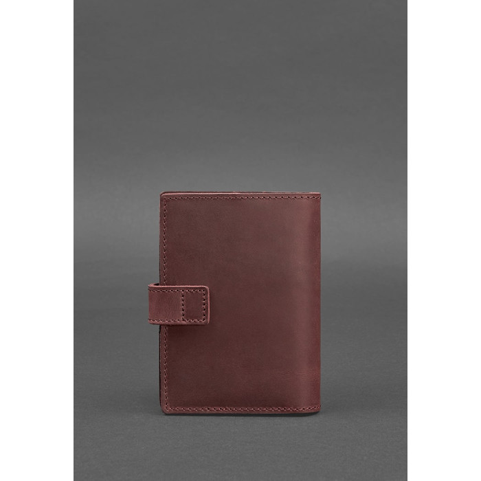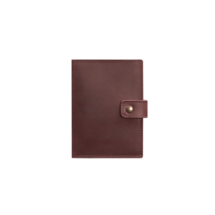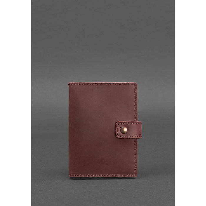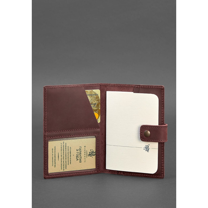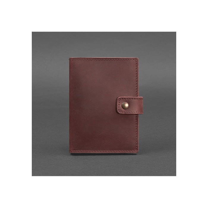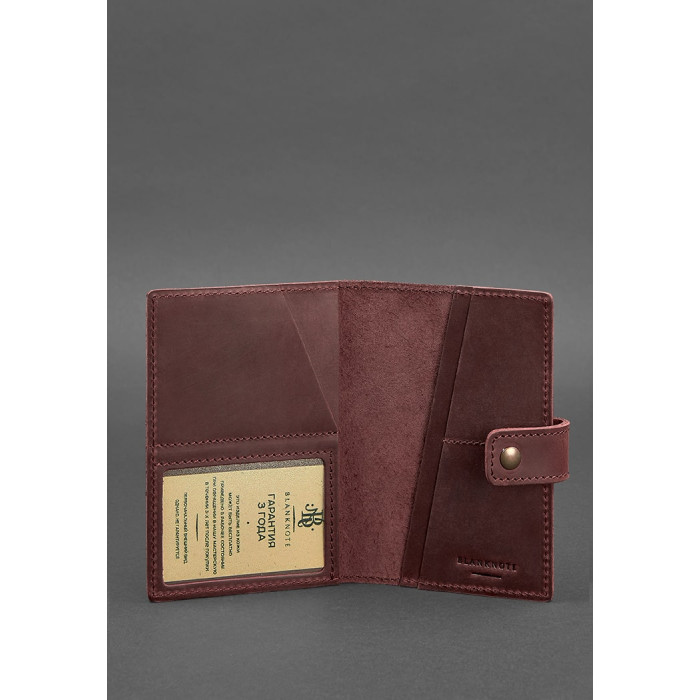 Бордова обкладинка з натуральної шкіри Crazy Horse має лаконічний і стильний дизайн. Всередині обкладинки є одне відділення для паспорта, кишеня з віконцем, де можна зберігати водійське посвідчення і три відділення для візиток і кредиток.